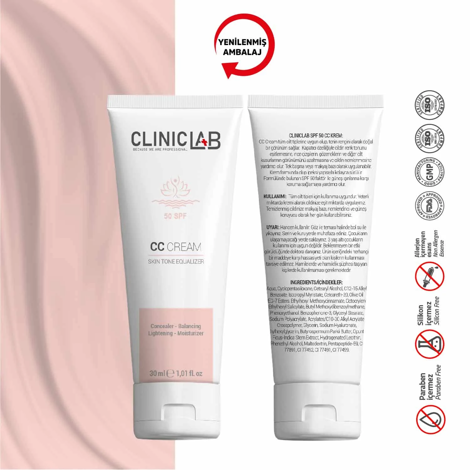 CC Cream tüm cilt tiplerine uygun olup, tenin rengini alarak doğal bir görünüm sağlar. Kapatıcı özelliğiyle cildin renk tonunu eşitlemesine, ince çizgilerin, gözeneklerin ve diğer cilt kusurlarının görünümünü azaltmasına ve cildin nemlenmesine yardımcı olur. Tek başına veya makyaj bazı olarak uygulanabilir. Krem formunda olup ipeksi yapısıyla kolayca sürülür. Formülünde bulunan SPF 50 faktör ile güneş ışınlarına karşı koruma sağlamaya yardımcı olur.