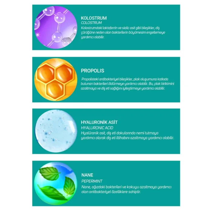 İçeriğinde bulunan Kolostrum, Propolis, Hyalüronik Asit, Myrrha, Ratanya, Nane, Adaçayı, Ekinezya, Papatya, Karanfil vb. aktifler sayesinde ağız içi bakım yapılmasına ve ferah nefes alınmasına yardımcı olur