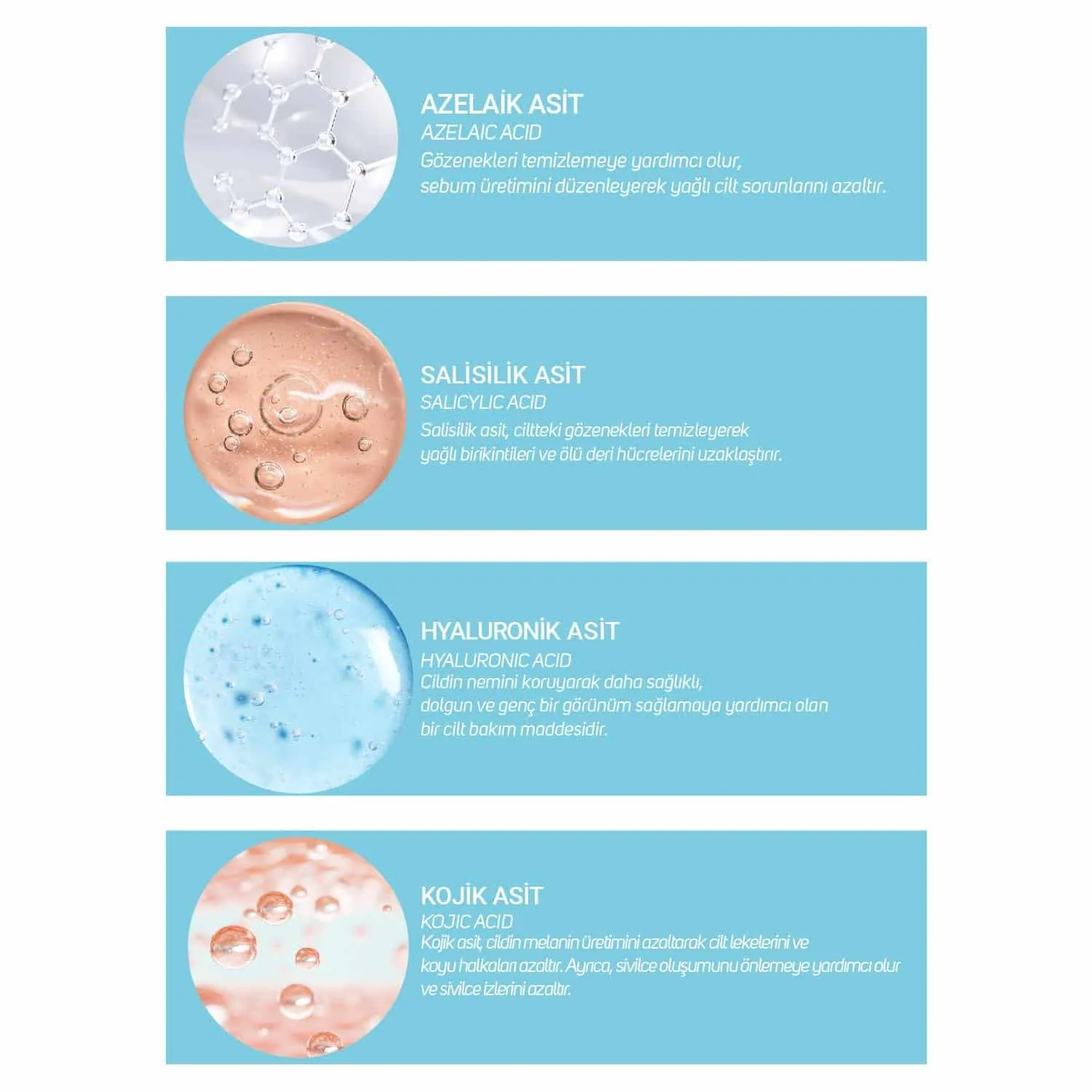 İÇİNDEKİLER : Aqua, Potassium Azeloyl Diglycinate, Sodium Ascorbyl Phosphate, Panthenol, Arbutin, Kojic Acid, Phenoxyethanol, Lactic Acid, Hyaluronic Acid, Isomalt, Phytol, Salicylic Acid, Azelaic Acid, Ethylhexylglycerin, PEG-40 Hydrogenated Castor Oil.