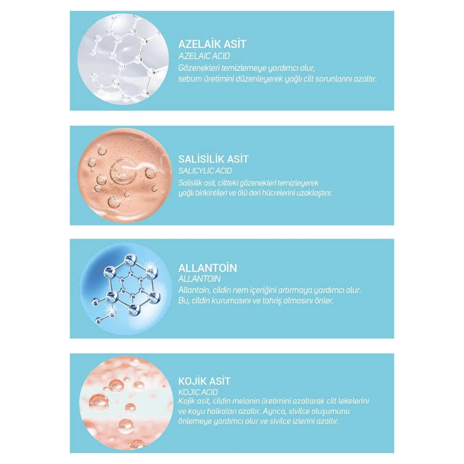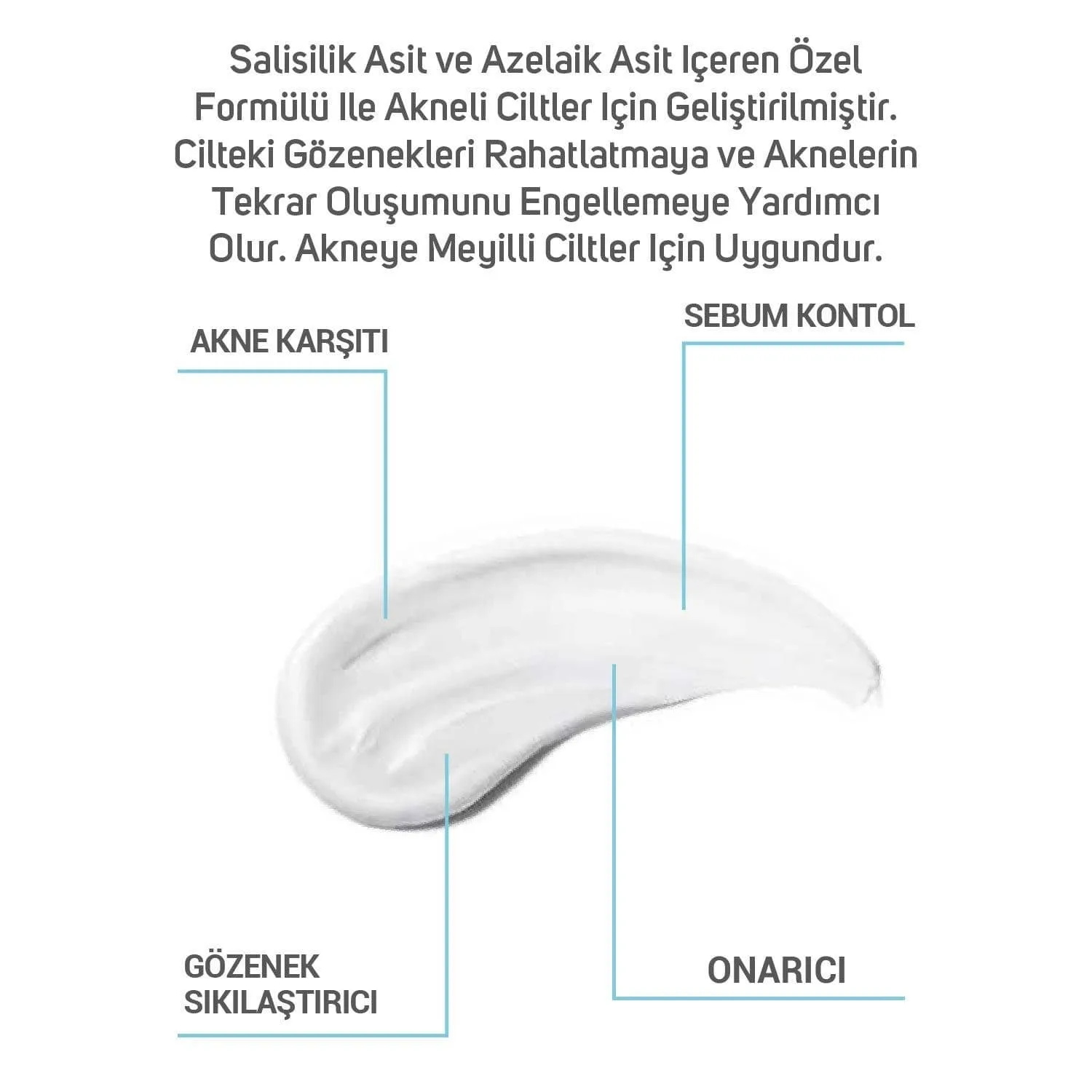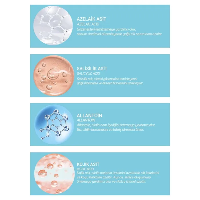 Salisilik Asit ve Azelaik Asit içeren özel formülü ile akneli ciltler için geliştirilmiştir. Cilteki gözenekleri rahatlatmaya ve aknelerin tekrar oluşumunu engellemeye yardımcı olur. Akneye meyilli ciltler için uygundur.