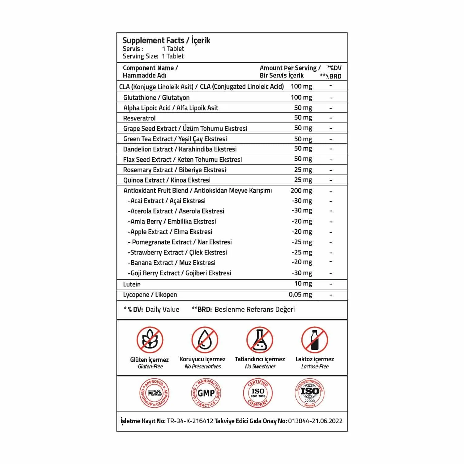 İçindekiler: Hacim Arttırıcı (Mikrokristalin selüloz), CLA (Konjuge Linoleik Asit), Glutatyon, stabilizör (polivinilpirolidon), Alfa Lipoik Asit, Resveratrol, Üzüm Tohumu Ekstresi, Karahindiba Ekstresi, Yeşil Çay Ekstresi, Keten Tohumu Ekstresi, Topaklanmayı önleyiciler (silikon dioksit, yağ asitlerinin magnezyum tuzları), Açai Ekstresi, Aserola Ekstresi, Gojiberi Ekstresi, Biberiye Ekstresi, Kuinoa Ekstresi, Nar Ekstresi, Çilek Ekstresi, Embilika Ekstresi, Elma Ekstresi, Muz Ekstresi, Lutein, Likopen.