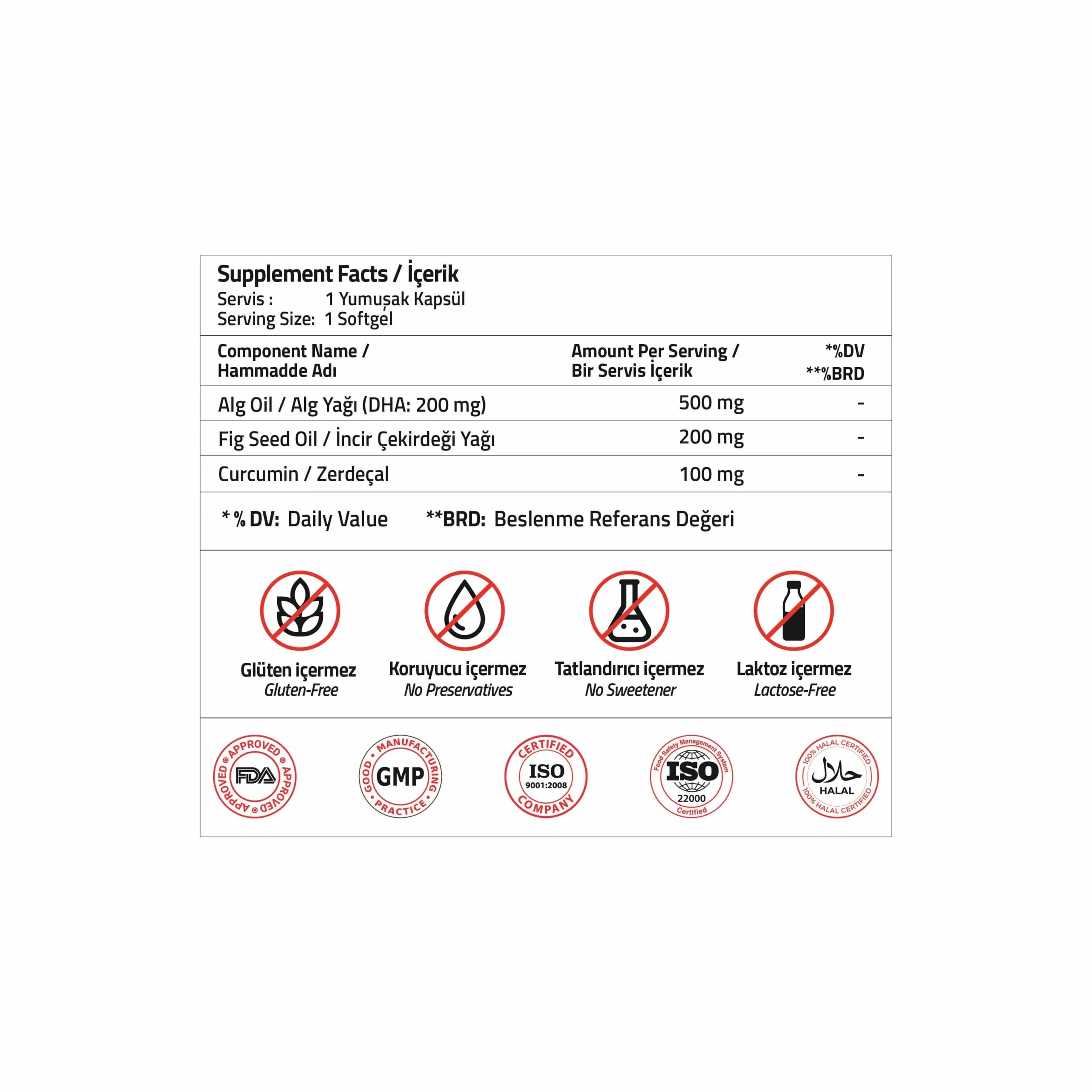 İçindekiler: Alg Yağı, İncir Çekirdeği Yağı, Zerdeçal Ekstresi, Ayçiçek Yağı, Sığır Jelatini, Gliserin, Deiyonize Su, Alfa Tokoferol (E 307), Renklendirici (Brilliant Blue FCF (E 133) Ponzo 4R, Koşineal Red A (E 124)) .