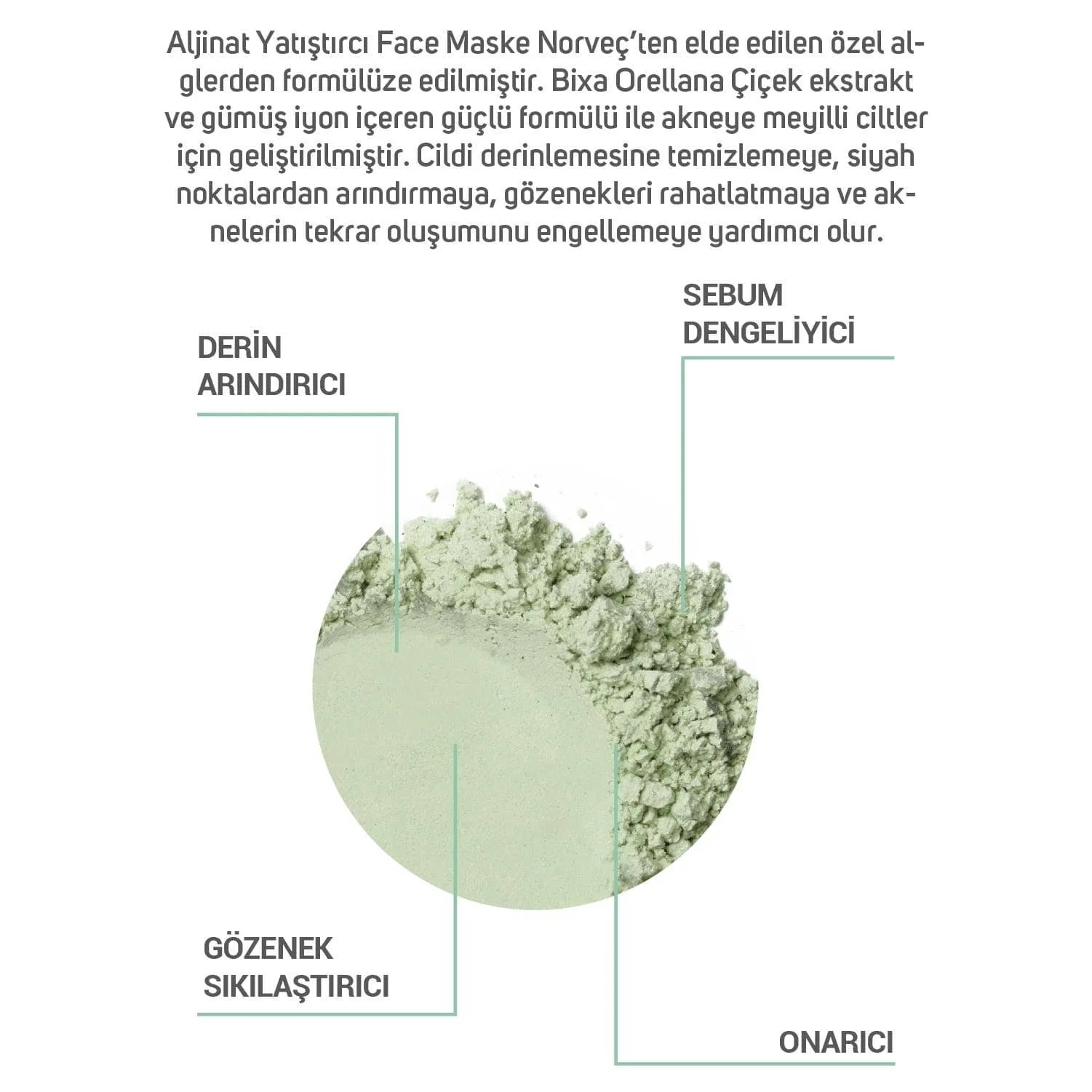 Aljinat Akne Karşıtı Maske Norveç’ten elde edilen özel alglerden formülüze edilmiştir. Bixa Orellana ÇiçeK ekstrakt ve gümüş iyon içeren güçlü formülü ile akneye meyilli ciltler için geliştirilmiştir. Cildi derinlemesine temizlemeye, siyah noktalardan arındırmaya, gözenekleri rahatlatmaya ve aknelerin oluşumunu engellemeye yardımcı olur.