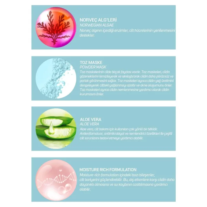 Aljinat Nemlendirici Yüz Maskesi Norveç’ten elde edilen özel alglerden formülize edilmiştir. Aloe Vera içeriği ile cildin nemlendirilmesine, onarılmasına ve rahatlatılmasına yardımcı olur. Tüm cilt tipleri için uygulanabilir. Özellikle kuru cilt tiplerine tavsiye edilir.