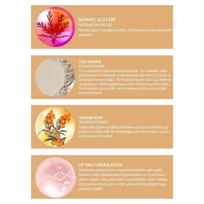 Aljinat Sıkılaştırıcı Yüz Maskesi Norveç’ten elde edilen özel alglerden formülize edilmiştir. İçeriğindeki Sea Berry Ekstrakt sayesinde cilt yapısını yenileyerek cildin korunmasına yardımcı olur. Cilt elastikiyetini artırarak, ışıltılı, dolgun ve sıkı bir cilt görünümü verir. Tüm cilt tipleri için uygun olmakla birlikte, bilhassa ileri yaş grupları için tavsiye edilir.