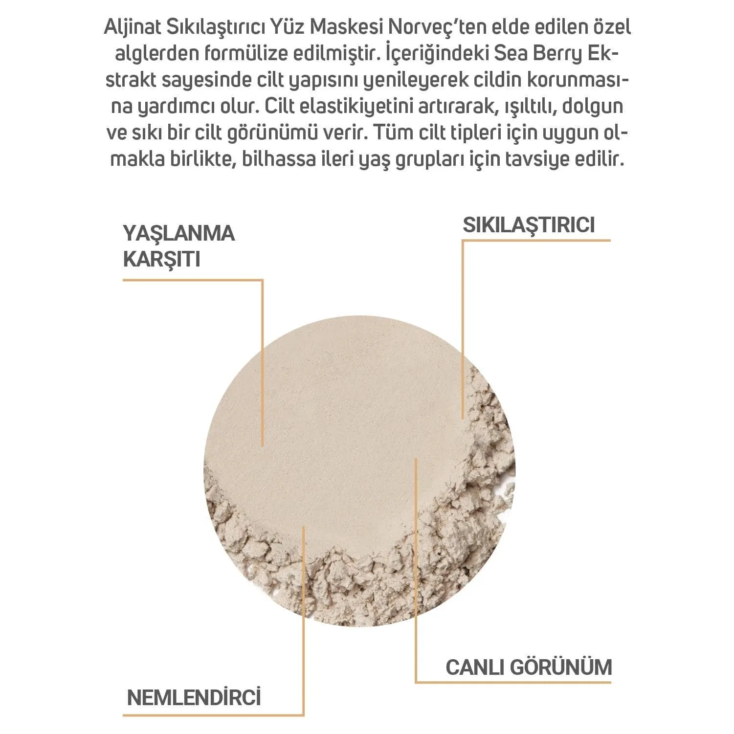 Aljinat Sıkılaştırıcı Yüz Maskesi Norveç’ten elde edilen özel alglerden formülize edilmiştir. İçeriğindeki Sea Berry Ekstrakt sayesinde cilt yapısını yenileyerek cildin korunmasına yardımcı olur. Cilt elastikiyetini artırarak, ışıltılı, dolgun ve sıkı bir cilt görünümü verir. Tüm cilt tipleri için uygun olmakla birlikte, bilhassa ileri yaş grupları için tavsiye edilir.