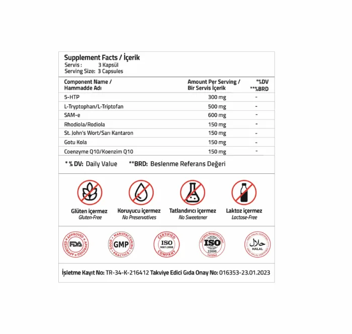 5-htp, L-Triptofan, SAM-e, Rodiola, Sarı Kantaron, Gotu Kola, Koenzim Q10, Kapsül Bileşeni (Hidroksipropil metil selüloz, Su, Agar, Karagenan, Sodyum Sitratlar), Hacim Arttırıcı (Mikrokristalin selüloz), Topaklanma önleyici maddeler, (silikon dioksit, yağ asitlerinin magnezyum tuzları).