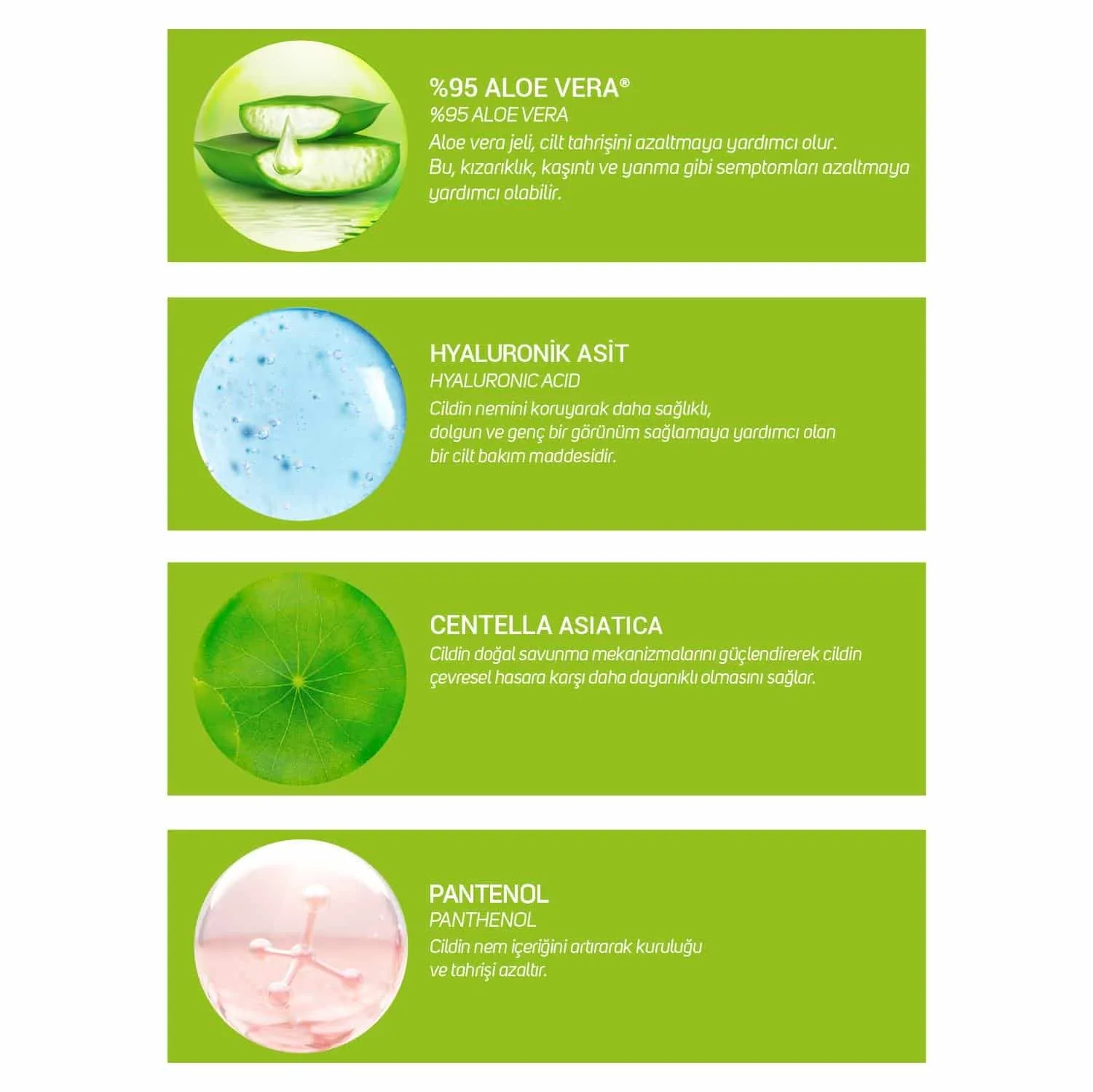 %95 Aloe Vera Jel zengin içeriği ile cildin nemlendirilmesine, onarılmasına ve rahatlatılmasına yardımcı olur.