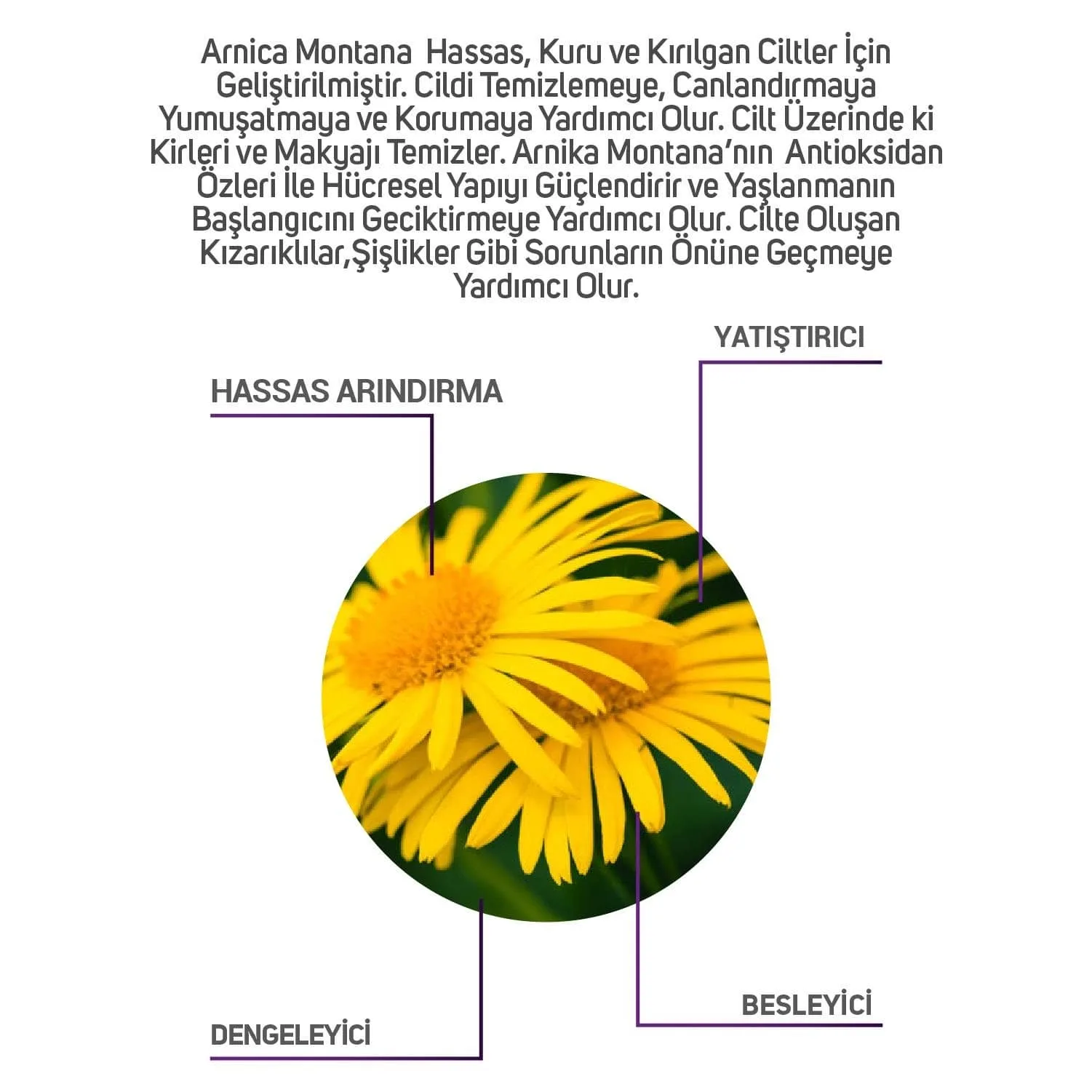 Hassas ve kuru ciltler için geliştirilmiştir. Arnica montananın antioksidan özleri ile cilde ihtiyacı olan nemi kazandırırarak; Cildi temizlemeye, canlandırmaya yumuşatmaya ve korumaya yardımcı olur. Cilt üzerindeki kirleri arındırır ve makyajı temizler.