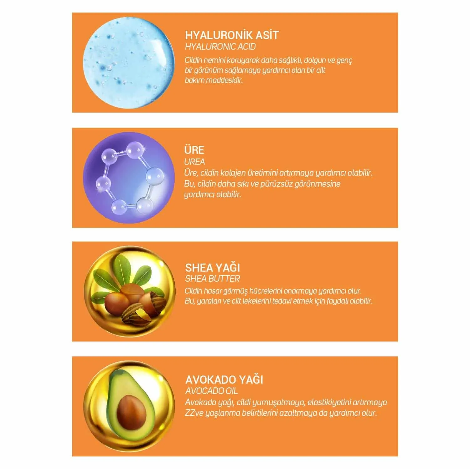 İÇİNDEKİLER : Aqua, Glycerin, Propylene Glycol, Urea, Cetearyl Alcohol, Dimethicone, Cyclopentasiloxane, Glyceryl Stearate, Ceteareth-20, Sodium Lactate, Lanolin, Butyrospermum Parkii Butter, Persea Gratissima Oil, Phenoxyethanol, Panthenol, Lonicera Caprifolium Extract, Sodium Polyacrylate, Allantoin, Zea Mays Germ Oil, Sodium Hyaluronate, Xanthan Gum, Tetrasodium EDTA, Menthol, Vegetable Oil, Ethylhexylglycerin, Melaleuca Alternifolia Leaf Oil, Sodium Stearoyl Lactylate , Caprylic/Capric Triglyceride, Triticum Vulgare Germ Oil, Chamomilla Recutita Flower Extract, Calendula Officinalis Flower Extract, Tocopheryl Acetate, Cetyl Alcohol, Simmondsia Chinensis Seed Extract, Macadamia Ternifolia Seed Oil, Triethanolamine, Sodium Carboxymethyl Betaglucan , Phytosterols, Tocopherol, Carnosine, Lactic Acid, Panthenyl Triacetate.