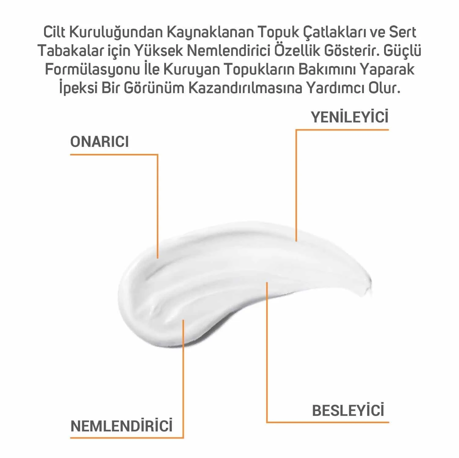 İçeriğinde bulunan Hyaluronik Asit, Shea Butter, Provitamin B5, Allantoin ve Üre sayesinde cilt kuruluğundan kaynaklanan topuk çatlakları ve sert tabakalar için yüksek nemlendirici özellik gösterir. Güçlü formülasyonu ile kuruyan topukların bakımını yaparak ipeksi bir görünüm kazandırılmasına yardımcı olur.