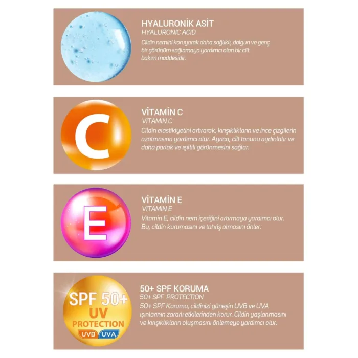Tüm cilt tiplerine uygun olup kapatıcı özelliğiyle cildin renk tonunu eşitlemesine, ince çizgilerin, gözeneklerin ve diğer cilt kusurlarının görünümünü azaltmasına ve cildin nemlenmesine yardımcı olur. Tek başına veya makyaj bazı olarak uygulanabilir. Krem formunda olup ipeksi yapısıyla kolayca sürülür. Formülünde bulunan SPF 50 faktör ile güneş ışınlarına karşı koruma sağlamaya yardımcı olur.