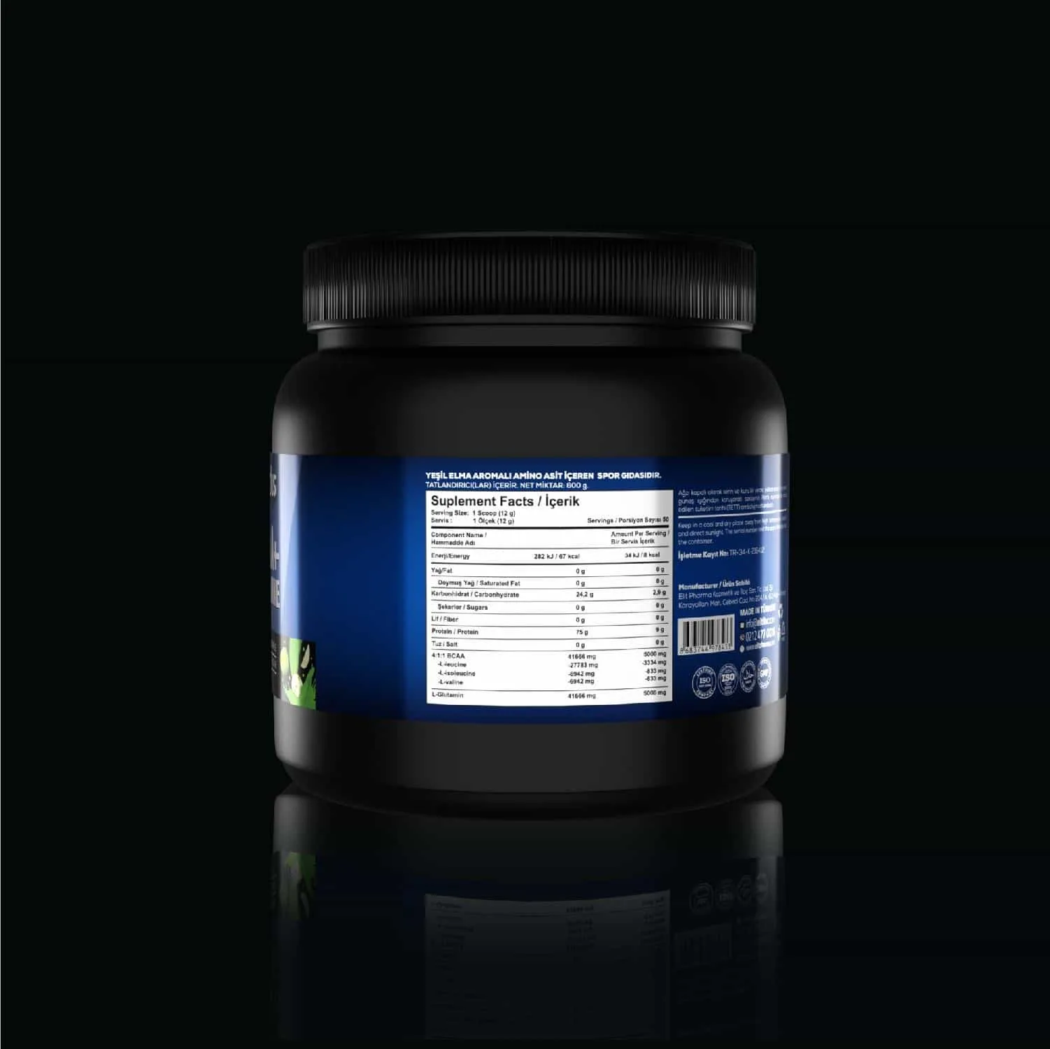 İçindekiler: BCAA 4:1:1 (L-Lösin, L-İzolösin, L-Valin), L-Glutamin, Asitlik Düzenleyici: Sitrik Asit (E330), Tatlandırıcı: Sukraloz (E955), Aroma Verici: Elma.