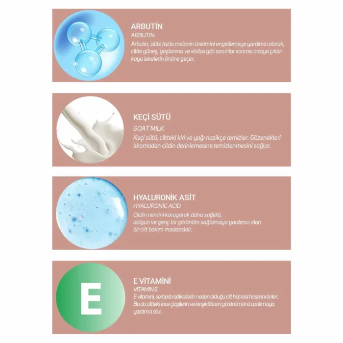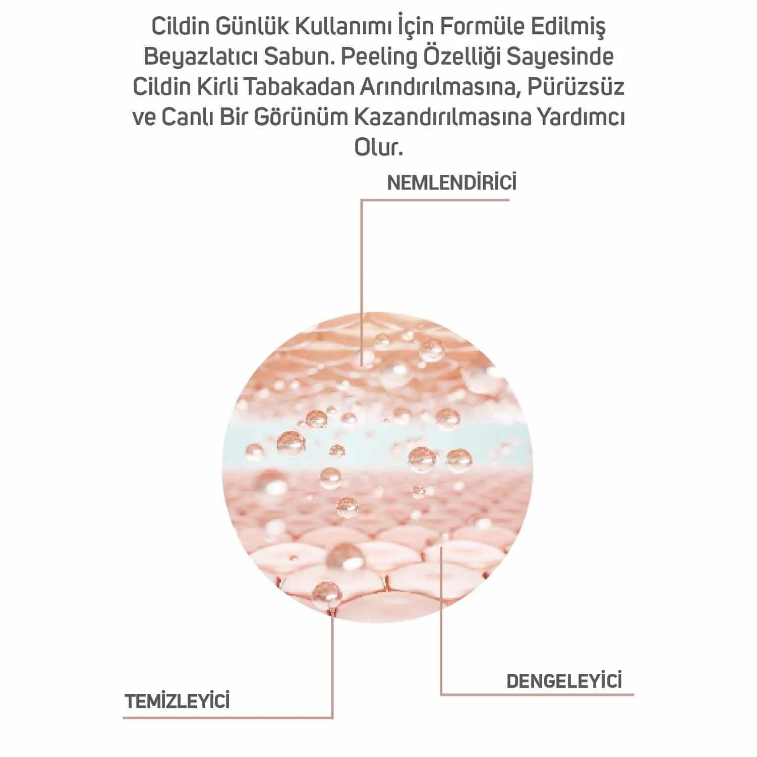 Cildin günlük kullanımı için formüle edilmiş beyazlatıcı sabun, Peeling özelliği sayesinde, cildin kirli tabakadan arındırılmasına ve pürüzsüz bir görünüm kazandırılmasına yardımcı olur.