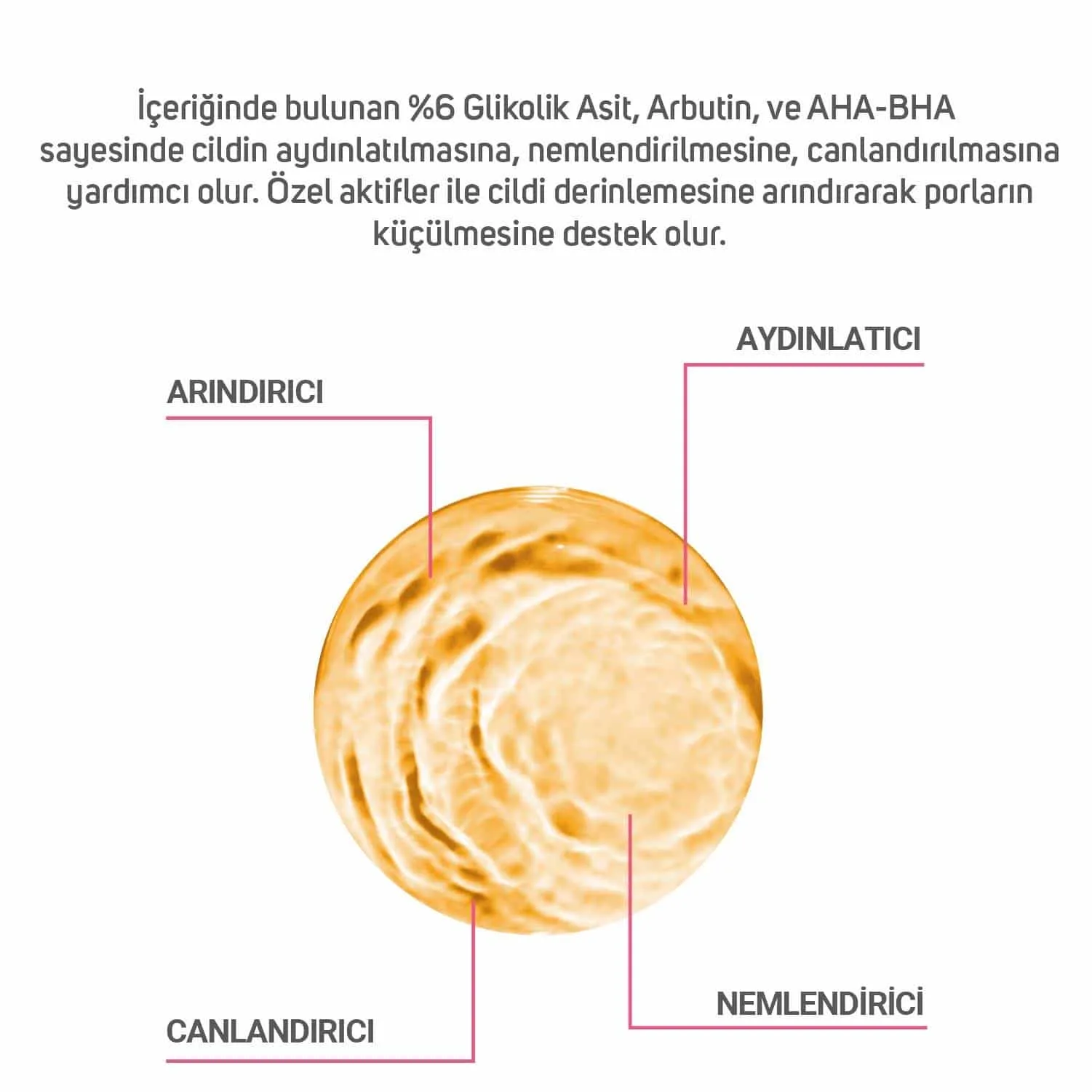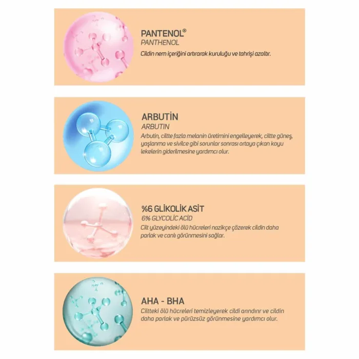 İçeriğinde bulunan %6 Glycolic Acid, Arbutin, ve AHA-BHA sayesinde cildin aydınlatılmasına, nemlendirilmesine, canlandırılmasına yardımcı olur. Özel aktifler ile cildi derinlemesine arındırarak gözeneklerin küçülmesine destek olur.
