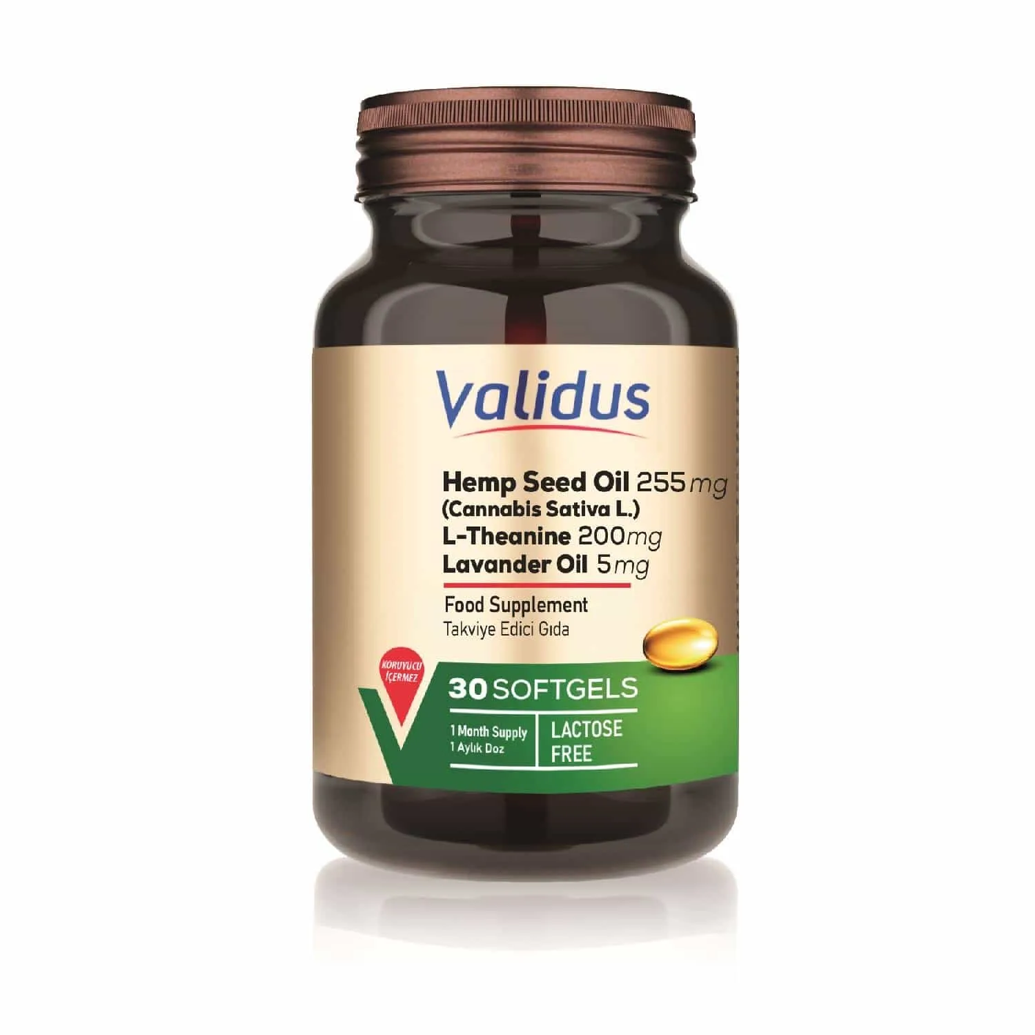 Kenevir Yağı, L-Teanin, Ayçiçek Yağı, Sığır Jelatini, Gliserin, Deiyonize Su, Alfa-tokoferol (E307) Renklendirici; Brown HT (E 155) Lavanta Yağı, Gül Ekstraktı.