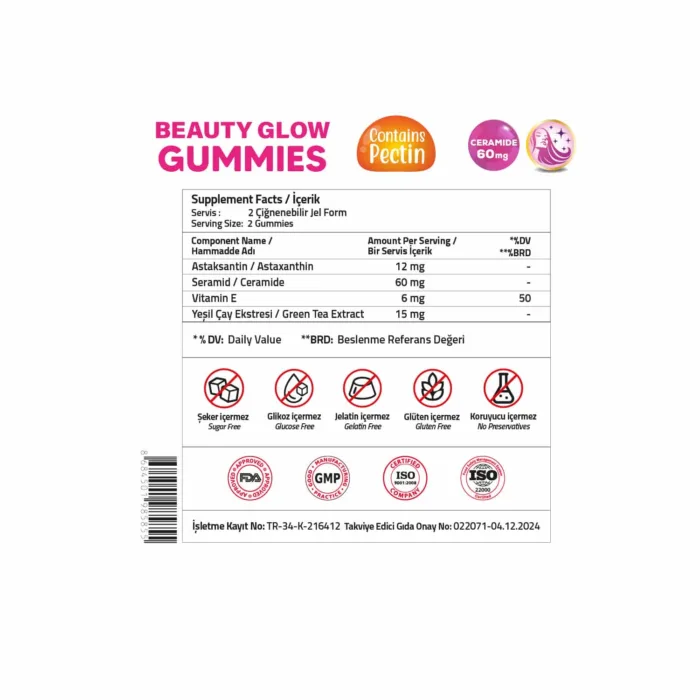 Validus Beauty Glow Astaxantin 40 mg + Seramid 30 mg+Vitamin E+ Yeşil Çay 60 Gummies