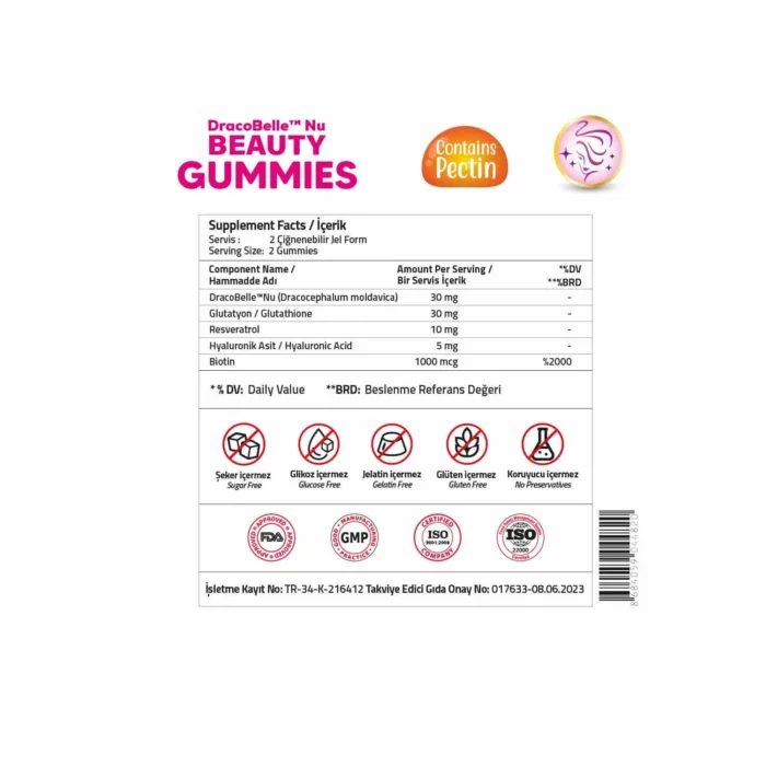 Stabilizör: Maltitol, Deiyonize Su, Jelleştirici: Pektin, Asitlik Düzenleyici: Sitrik Asit, Dracocephalum moldavica, Glutatyon, Aroma Verici: Çilek Aroması, Resveratrol, Tatlandırıcı: Sukraloz, Hyaluronik Asit, Renklendirici: Pancar Kökü Kırmızısı, D-Biotin.