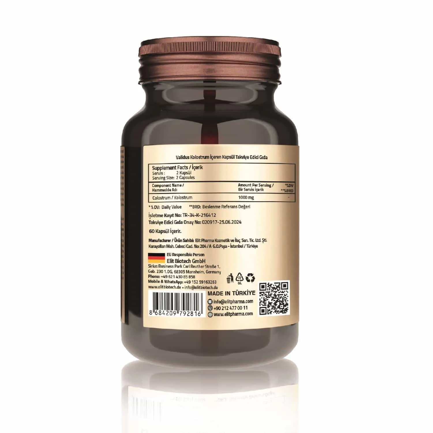 İçindekiler: Kolostrum, Hacim Arttırıcı: Mikrokristalin Selüloz, Topaklanmayı Önleyiciler (Yağ Asitlerinin Magnezyum Tuzları: Magnezyum Stearat, Silikon Dioksit), Kapsül Bileşeni: Hidroksipropil Metil Selüloz.