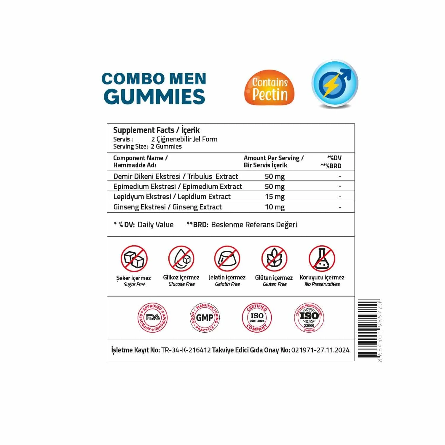 İçindekiler: Demir Dikeni Ekstresi, Epimedium Ekstresi, Lepidyum Ekstresi, Ginseng Ekstresi, Stabilizör: Maltitol, Deiyonize Su, Jelleştirici: Pektin, Asitlik Düzenleyici: Sitrik Asit, Aroma Verici: Portakal Aroması, Tatlandırıcı: Sukraloz, Renklendirici: Pancar Kökü Kırmızısı.