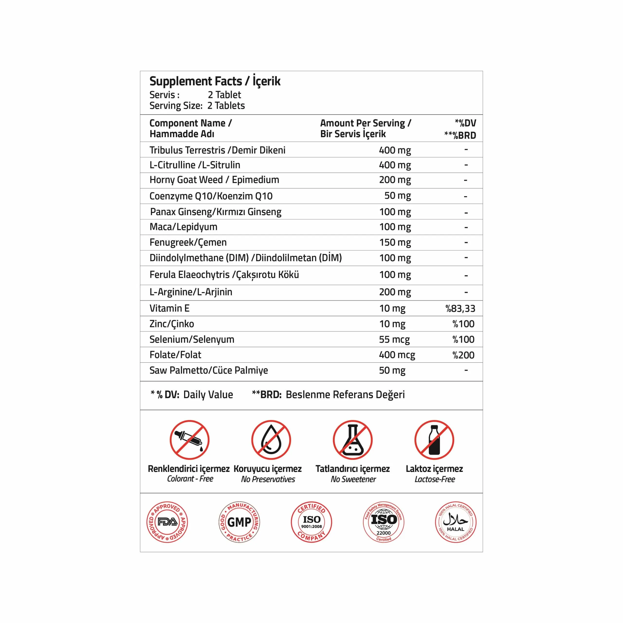 Demir Dikeni, L-Sitrulin, Epimedium, Koenzim Q10, Kırmızı Ginseng, Lepidyum, Çemen Tohumu, Diindolilmetan (DİM), Çakşırotu Kökü, L-Arjinin, Alfa Tokoferil Asetat, Çinko Sülfat Monohidrat, Sodyum Selenit, Kalsiyum L-Metil Folat, Cüce Palmiye, Hacim Arttırıcı (Mikrokristalin selüloz), Stabilizör (polivinilpirolidon), Topaklanmayı önleyiciler (silikon dioksit, yağ asitlerinin magnezyum tuzları).