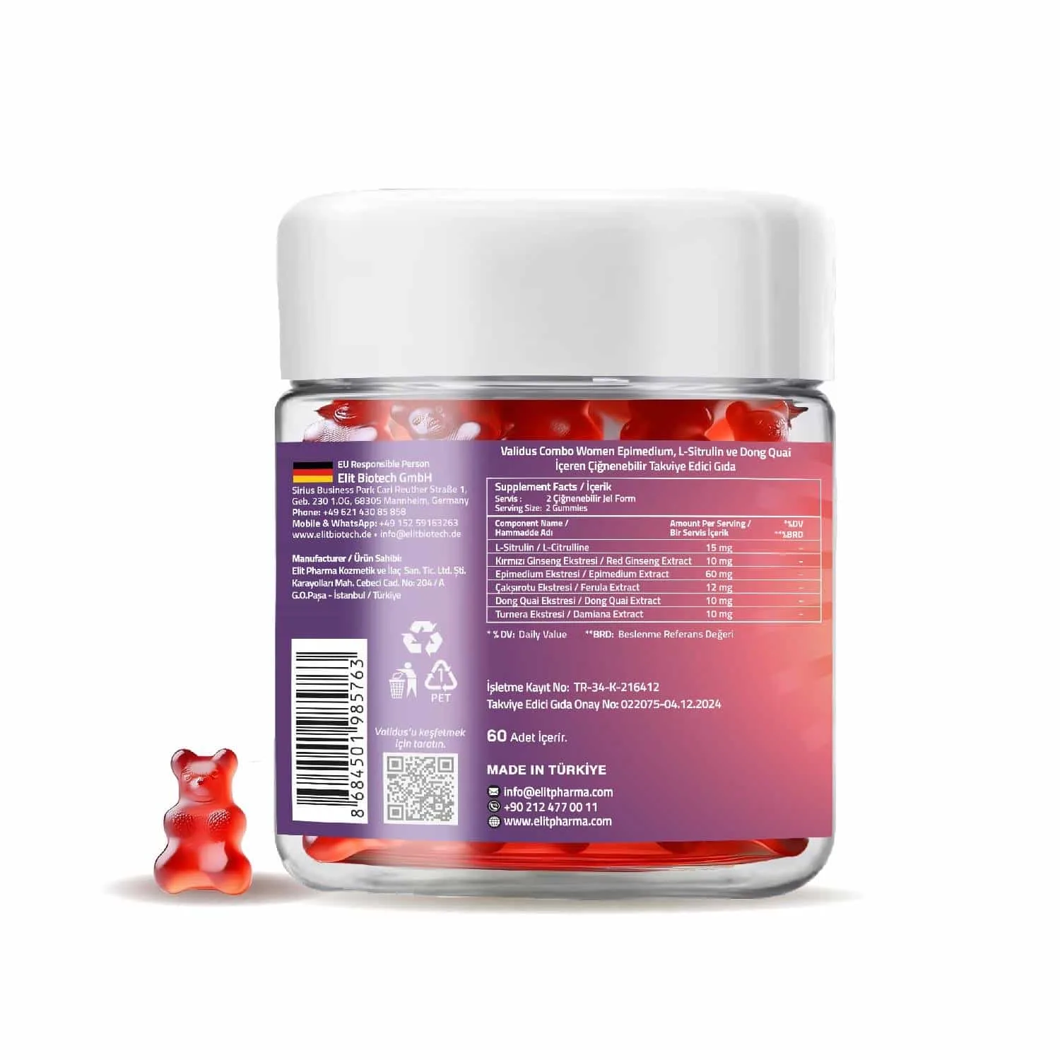 İçindekiler: L-Sitrulin, Kırmızı Ginseng Ekstresi, Epimedium Ekstresi, Çakşırotu Ekstresi, Dong Quai Ekstesi, Turnera Ekstresi, Stabilizör: Maltitol, Deiyonize Su, Jelleştirici: Pektin, Asitlik Düzenleyici: Sitrik Asit, Aroma Verici: Çilek Aroması, Tatlandırıcı: Sukraloz, Renklendirici: Pancar Kökü Kırmızısı.