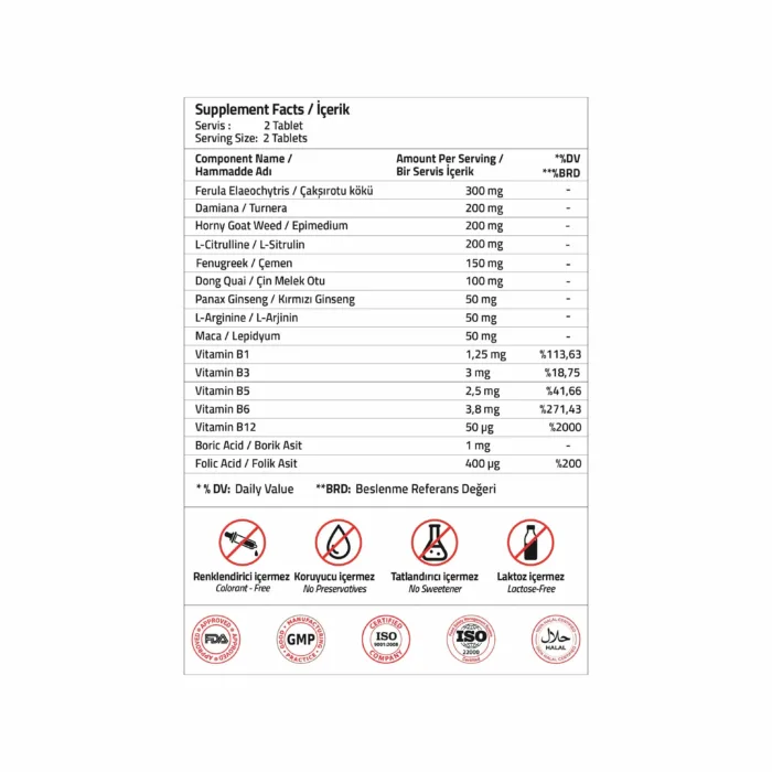 Çakşırotu kökü, Turnera, Epimedium, L-Sitrulin, Çemen Otu, Çin Melek Otu, Kırmızı Ginseng, L-Arjinin, Lepidyum, Vitamin B1, Vitamin B3, Vitamin B5, Vitamin B6, Vitamin B12, Borik Asit, Folik Asit, Hacim Arttırıcı (Mikrokristalin selüloz), stabilizör (polivinilpirolidon), Topaklanmayı önleyiciler (silikon dioksit, yağ asitlerinin magnezyum tuzları).