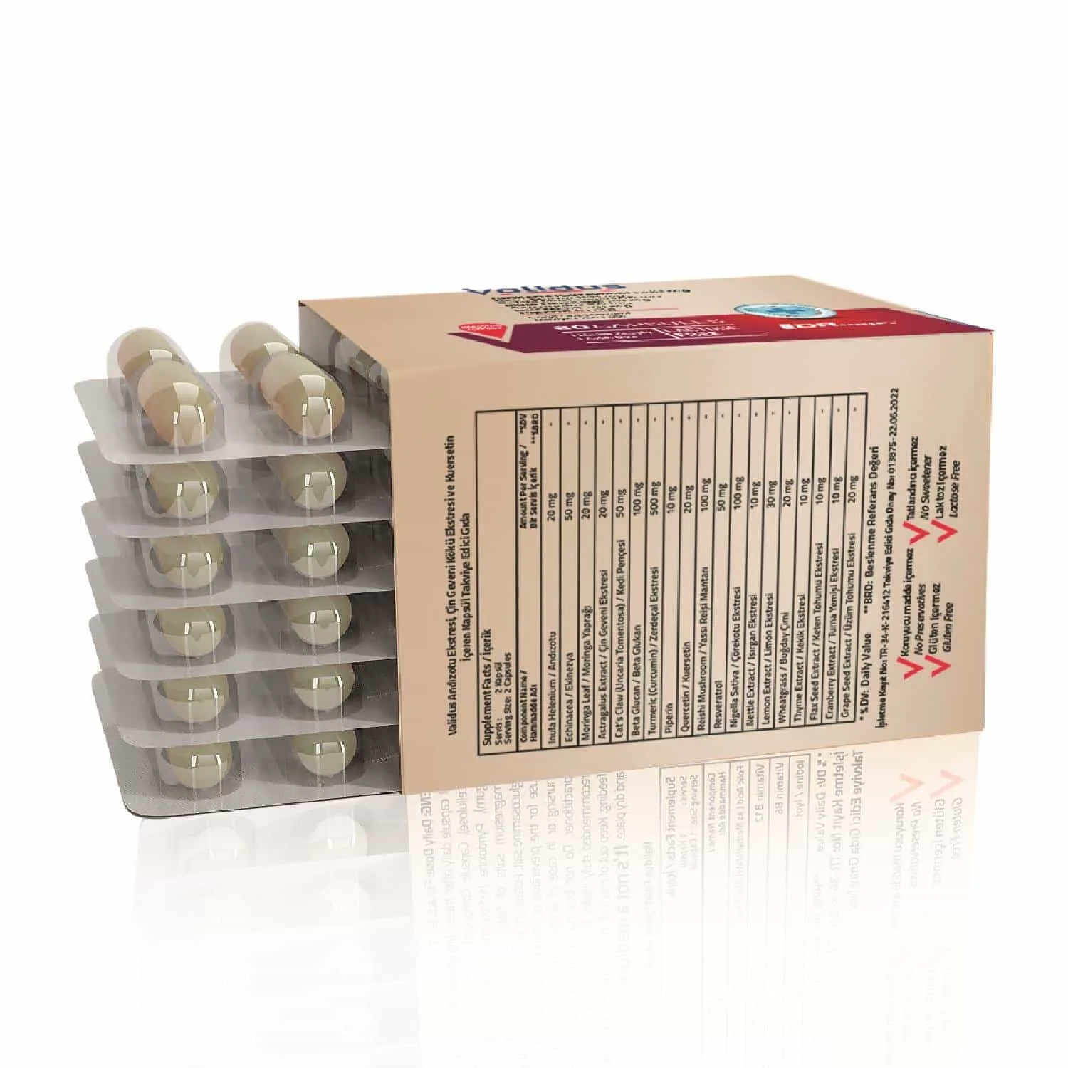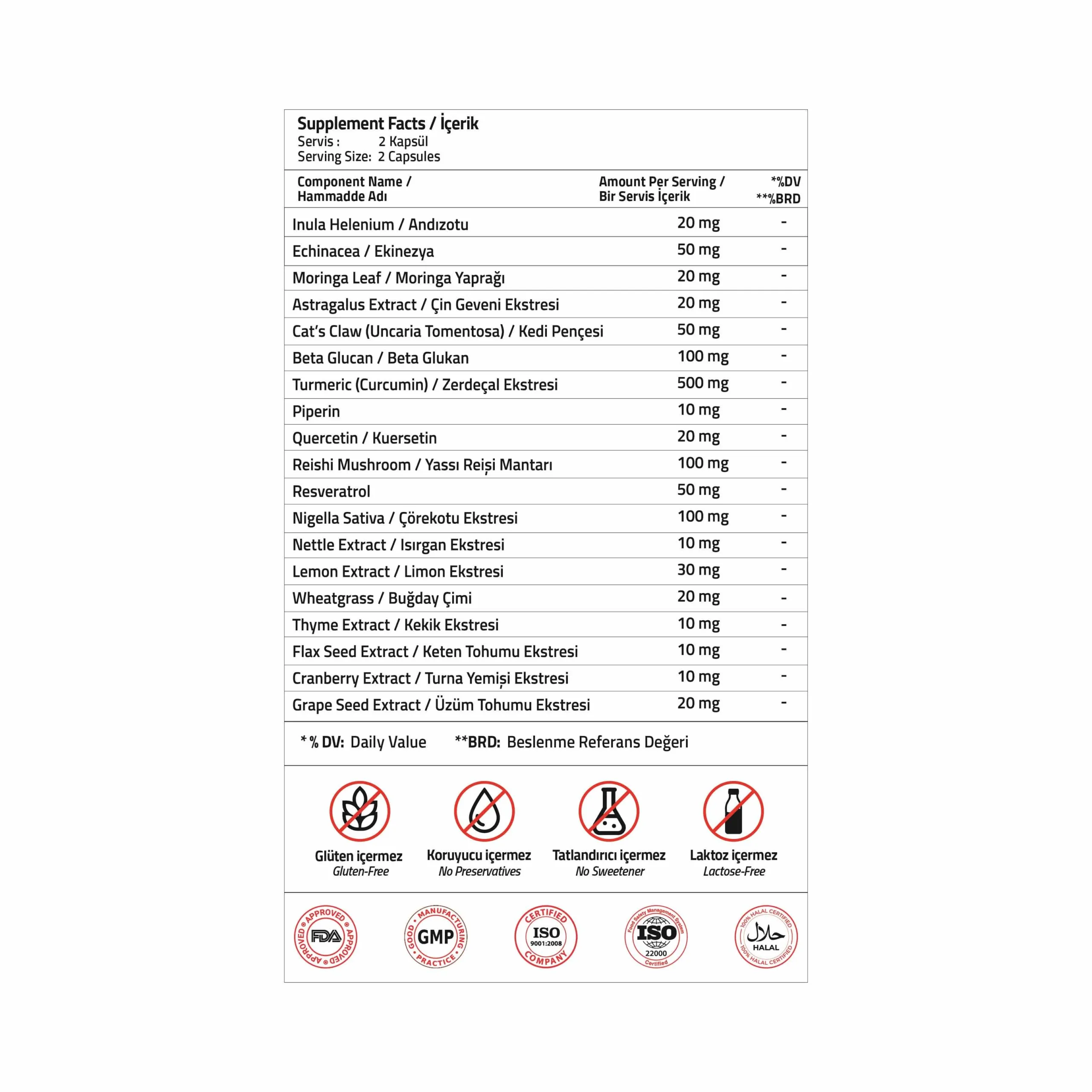 İçindekiler: Zerdeçal Kökü Ekstresi, Hidroksipropil Metil Selüloz, Mikrokristalin Selüloz, Beta Glukan, Yassı Reişi Mantarı, Çörekotu Tohumu Ekstresi, Ekinezya Ekstresi, Kedi Pençesi Ekstresi, Resveratrol, Yağ Asitlerinin Magnezyum Tuzları: Magnezyum Stearat, Limon Ekstresi, Silikon Dioksit, Andızotu Ekstresi, Moringa Yaprağı Ekstresi, Çin Geveni Kökü Ekstresi, Kuersetin, Buğday Tohumu Ekstresi, Üzüm Tohumu Ekstresi, Kekik Ekstresi, Karabiber Ekstresi, Isırgan Ekstresi, Keten Tohumu Ekstresi, Turna Yemişi Ekstresi.