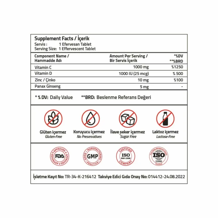 İçindekiler: L-Askorbik Asit, Asitlik Düzenleyici: Sitrik Asit (E 330), Sodyum Hidrojen Karbonat E500(ii), Hacim Arttıncı: Sorbitol (E420), Sodyum Karbonat E 500(1), Topaklanmayı önleyici: Polietilen Glikol (E 1521), Portakal Aroma verici, Renklendirici: Beta Karoten (E 160a), stabilizör: Polivinilpirolidon (E 1201), Panax Ginseng, Çinko Sülfat Monohidrat, Tatlandırıcı: Sukraloz (E 955), Silikon Dioksit (E 551), Kolekalsiferol.