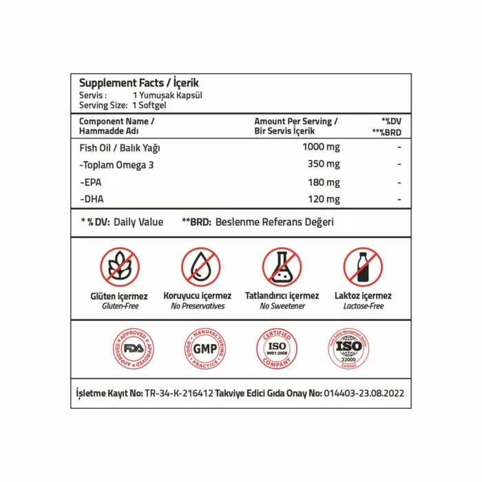 Balık Yağı, Kapsül Bileşenleri (Sığır Jelatin, Su, Nemlendirici: Gliserol), Limon kabuğu yağı, Alfa Tokoferol.