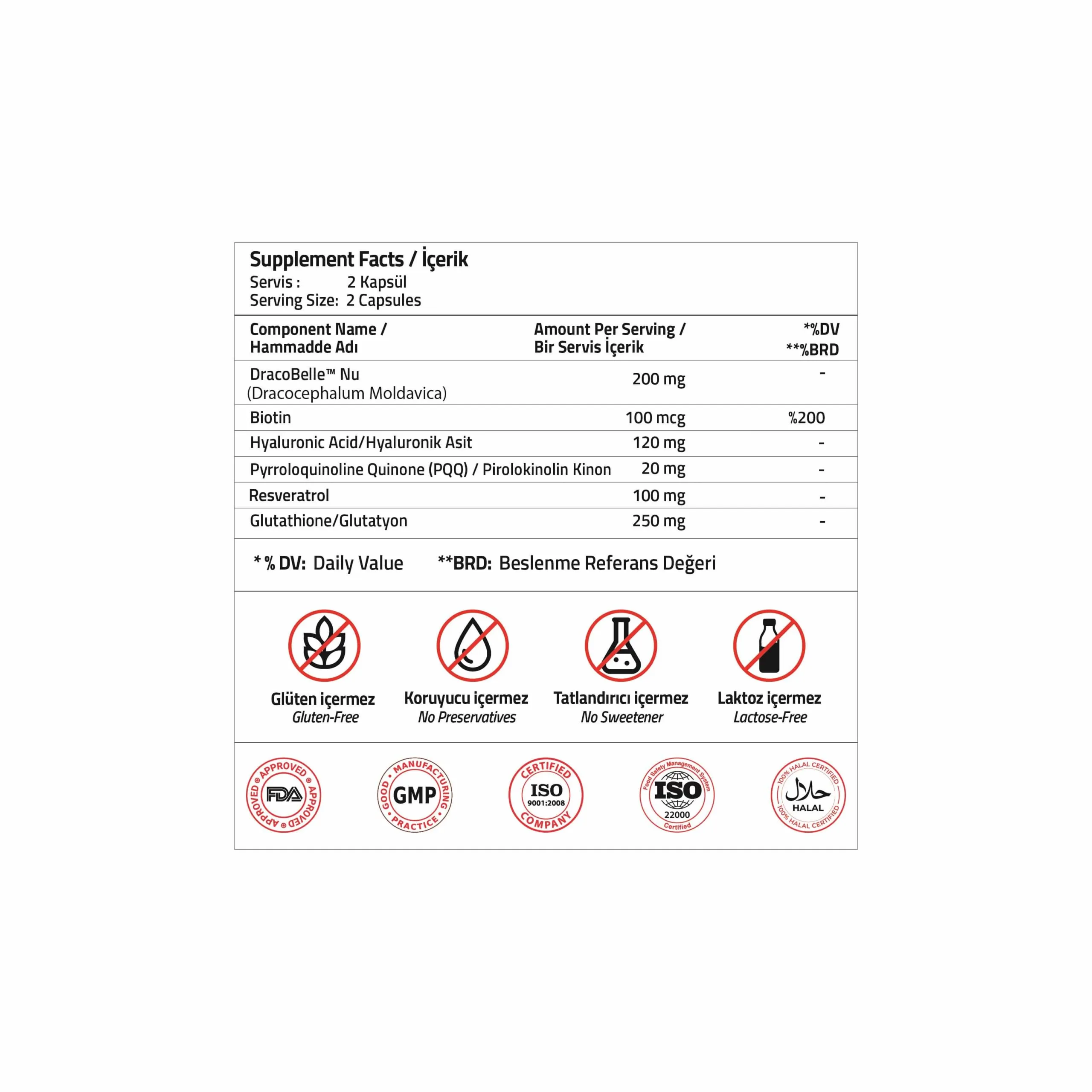 İçindekiler: Dracocephalum Moldavica, Biotin, Hyaluronik Asit, Pirolokinolin Kinon, Resveratrol, Glutatyon, Kapsül Bileşeni (Hidroksipropil metil selüloz, Gellan zamkı), Hacim Arttırıcı (Mikrokristalin selüloz), Topaklanma önleyici maddeler, (silikon dioksit, yağ asitlerinin magnezyum tuzları).