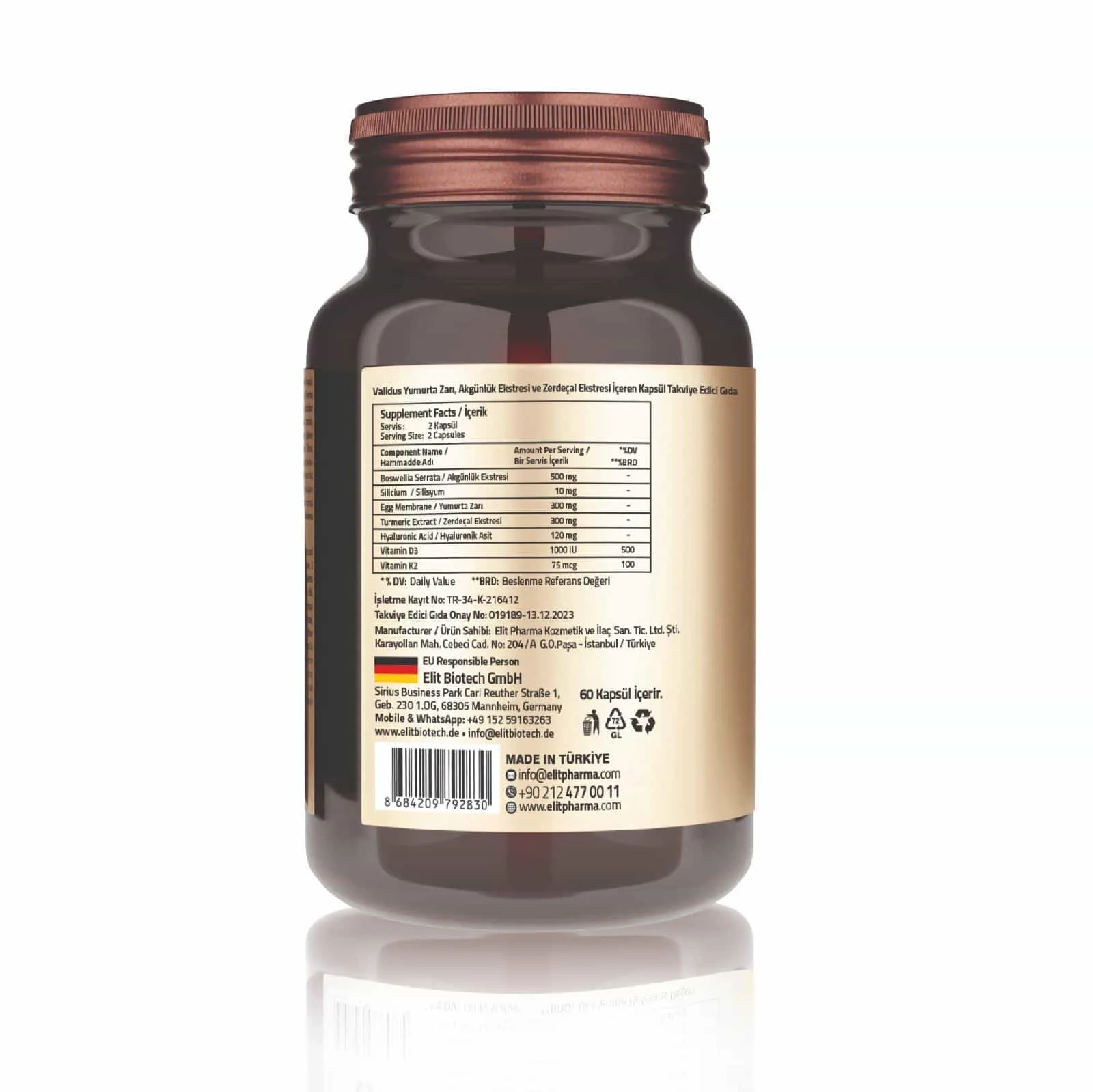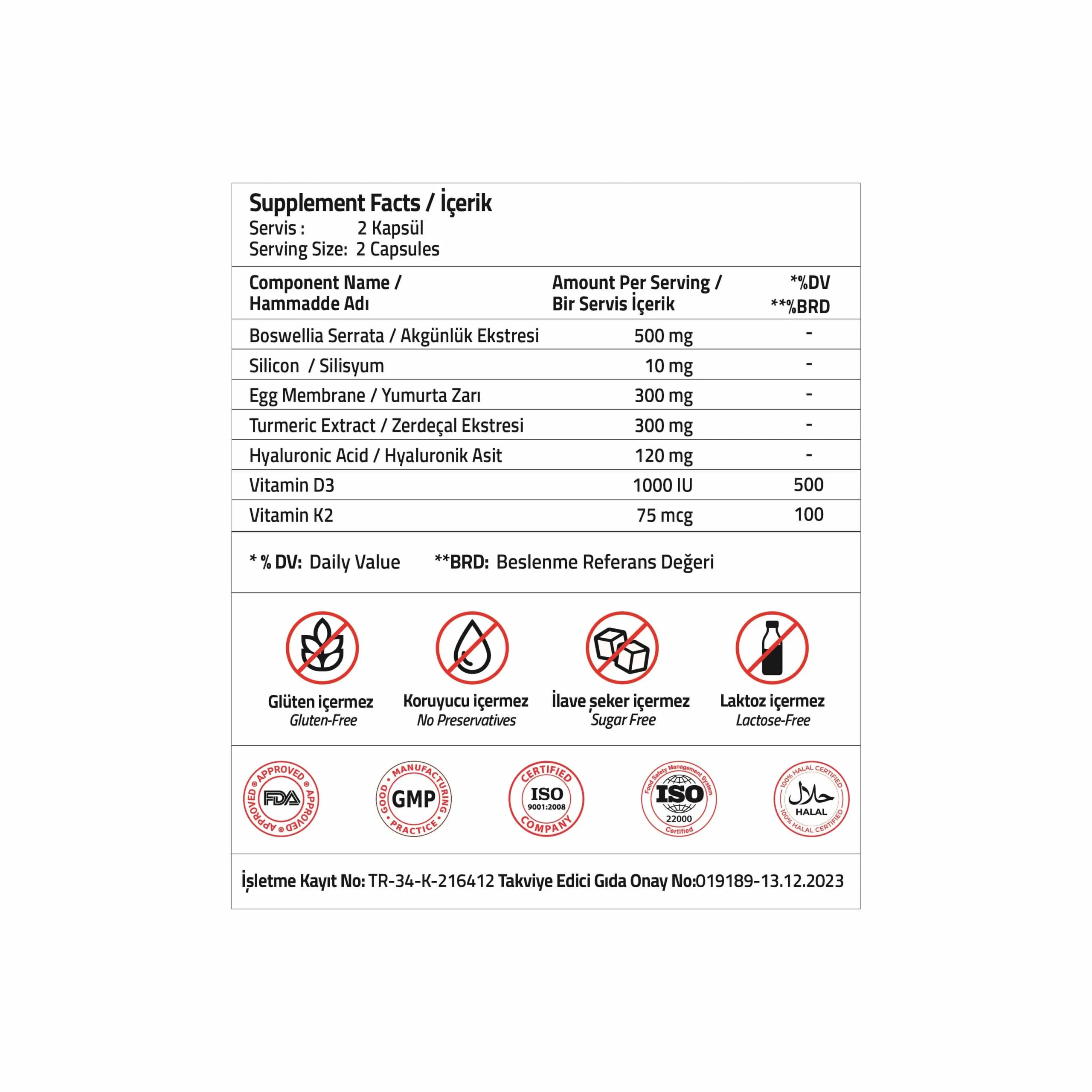 İçindekiler: Akgünlük Ekstresi, Silisik Asit Preparatı, Yumurta Zarı, Zerdeçal Ekstresi, Hyaluronik Asit, Mikrokristalin Selüloz (E 460 (i)), Kolekalsiferol, Yağ Asitlerinin Magnezyum Tuzları: Magnezyum Stearat (E 470b), Silikon Dioksit (E 551), Menakuinon, Kapsül Bileşeni (Hidroksipropil Metil Selüloz).