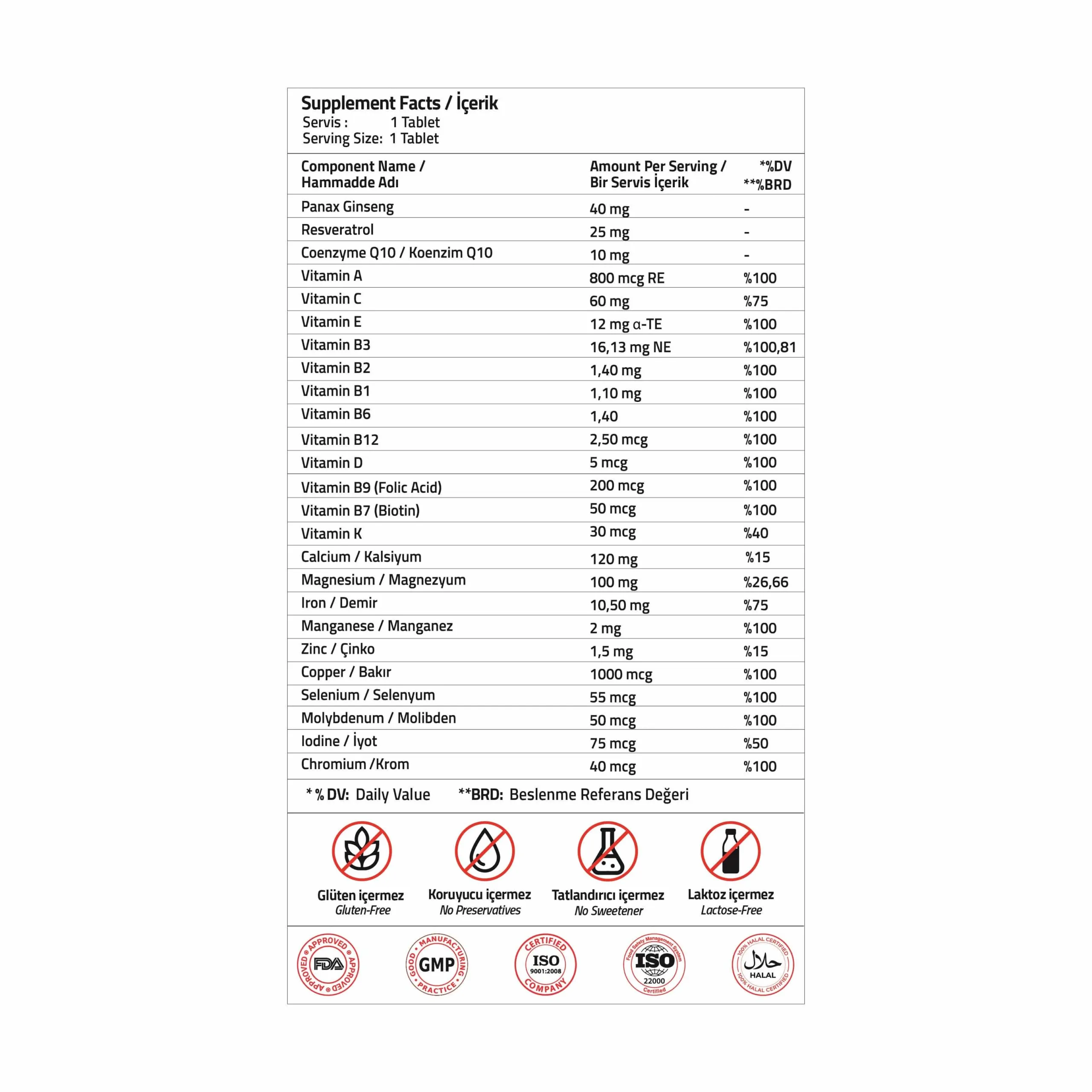 Hacim Arttırıcı (Mikrokristalin selüloz), Kalsiyum Karbonat, Magnezyum Oksit, stabilizör (polivinilpirolidon), Resveratrol, Nikotinamid, Retinil Palmitat, Koenzim Q 10, Manganez Sülfat, Çinko Sülfat Monohidrat, Bakır Sülfat, Kolekalsiferol, Pridoksin Hidroklorür, Menakuinon 7, Tiamin Hidroklorür, Riboflavin, Topaklanmayı önleyiciler (silikon dioksit, yağ asitlerinin magnezyum tuzları), Krom Pikolinat, Pteroilmonoglutamik Asit, Sodyum Selenit, Sodyum Molibdat, Potasyum İyodür, D-Biotin, Metilkobalamin.