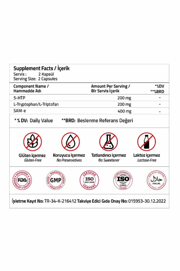 5-htp, L-Triptofan, Kapsül Bileşeni (Hidroksipropil metil selüloz, Su, Agar, Karagenan, Sodyum Sitratlar), Hacim Arttırıcı (Mikrokristalin selüloz), Topaklanma önleyici maddeler, (silikon dioksit, yağ asitlerinin magnezyum tuzları).