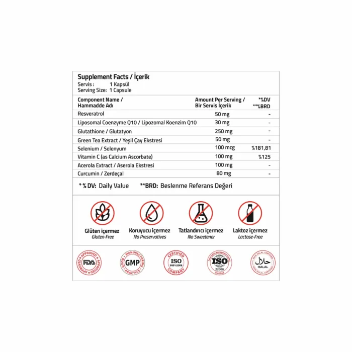 İçindekiler: Glutatyon, Kalsiyum L-Askorbat, Resveratrol, Koenzim Q10 (Lipozomal), Aserola Ekstresi, Zerdeçal Kök Ekstresi, Yeşil Çay Ekstresi, Kapsül Bileşeni (Hidroksipropil metil selüloz, Gellan zamkı), Hacim Arttırıcı (Mikrokristalin selüloz), Topaklanmayı önleyiciler (silikon dioksit, yağ asitlerinin magnezyum tuzları), Sodyum Selenit.