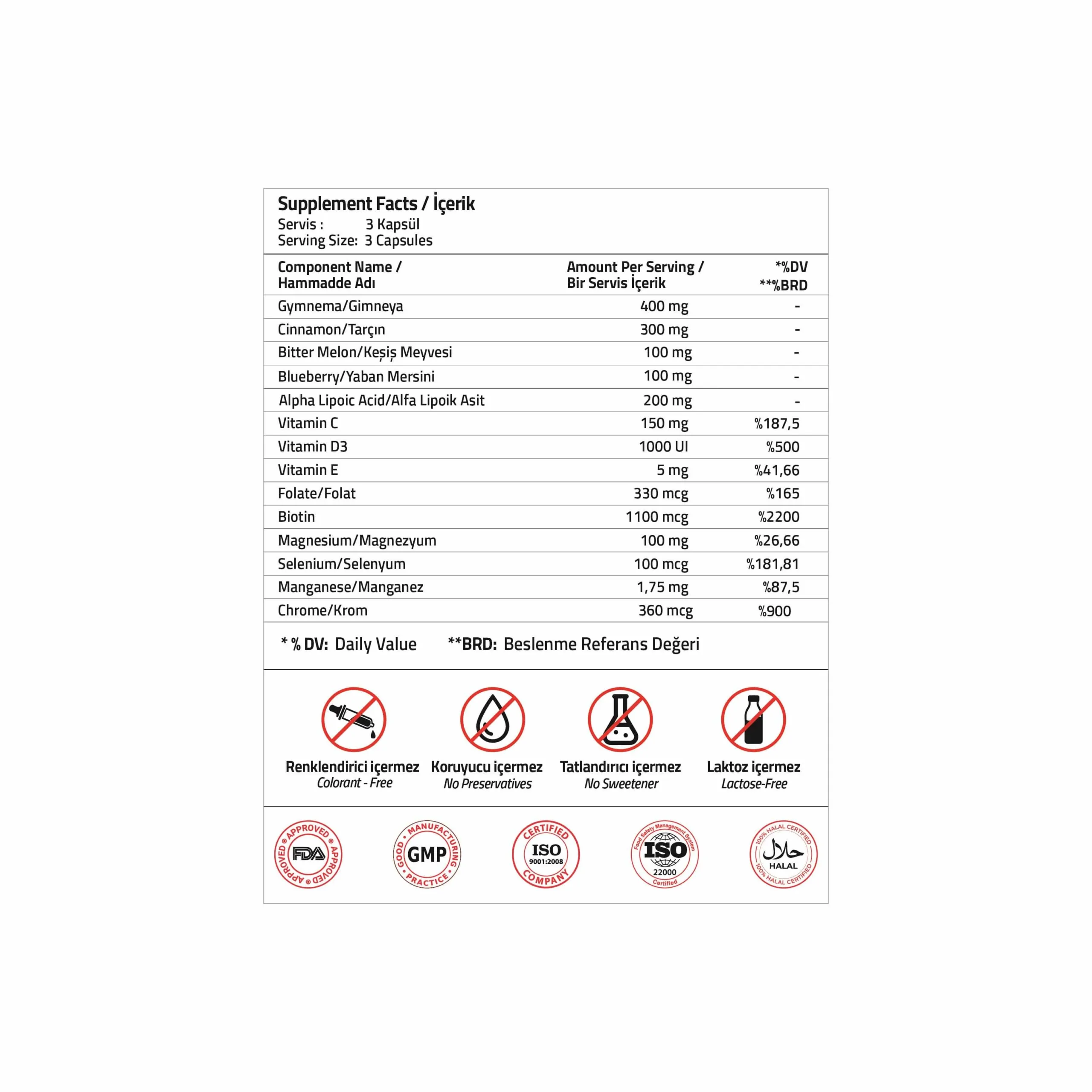 Tarçın, Gimneya, Keşiş Meyvesi, Yaban Mersini, Alfa Lipoik Asit, Vitamin C, Vitamin D3, Vitamin E, Folat, Biotin, Magnezyum Oksit, Sodyum Selenit, Manganez Sülfat, Krom Pikolinat, Kapsül Bileşeni (Hidroksipropil metil selüloz, Su, Agar, Karagenan, Sodyum Sitratlar), Hacim Arttırıcı (Mikrokristalin selüloz), Topaklanma önleyici maddeler, (silikon dioksit, yağ asitlerinin magnezyum tuzları).