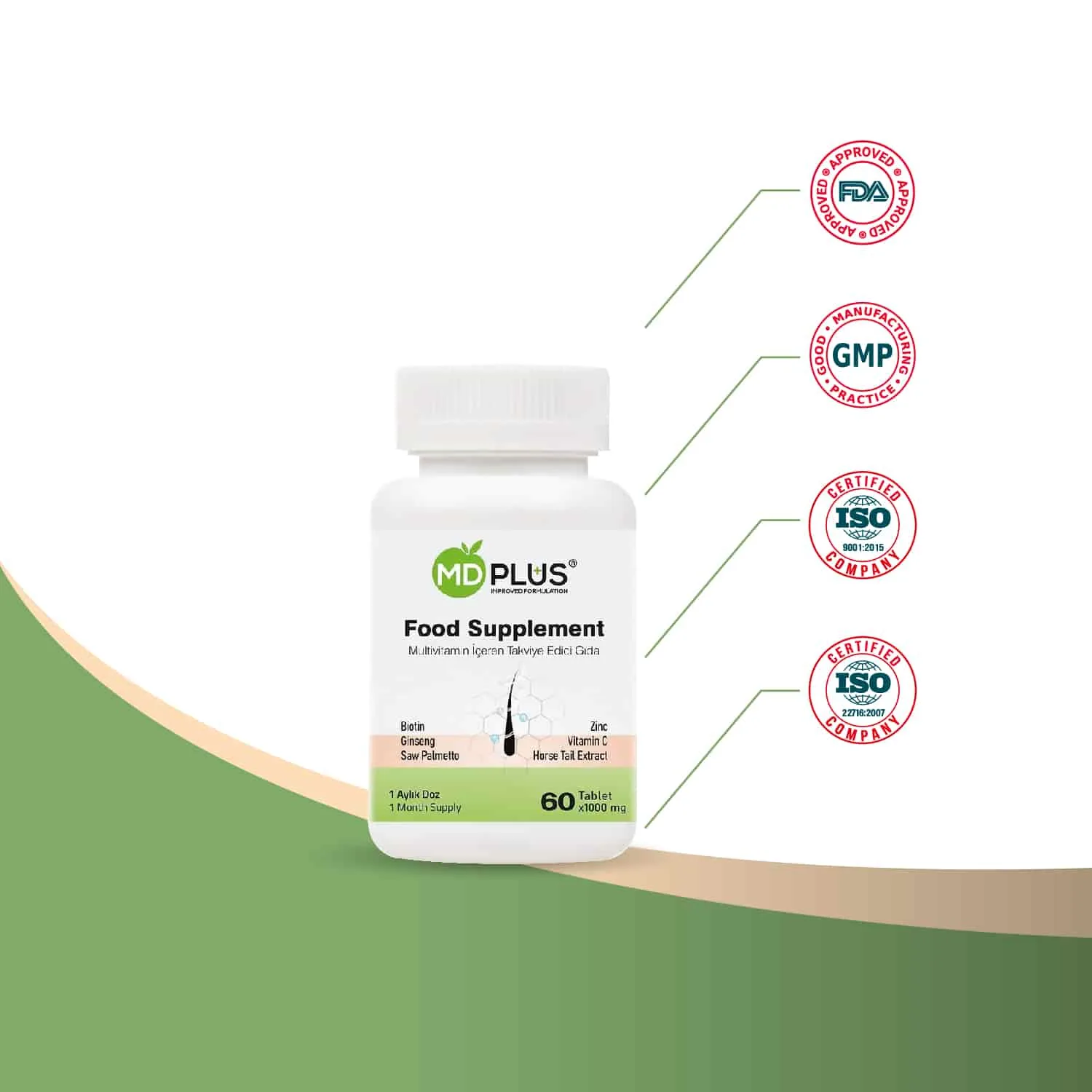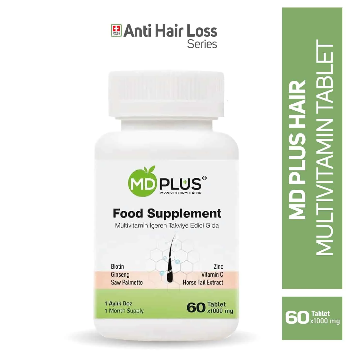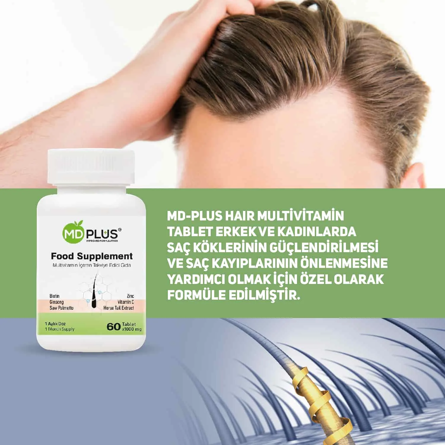 MD-PLUS Hair Multivitamin Tablet erkek ve kadınlarda saç köklerinin güçlendirilmesi ve saç kayıplarının önlenmesine yardımcı olmak için özel olarak formüle edilmiştir.