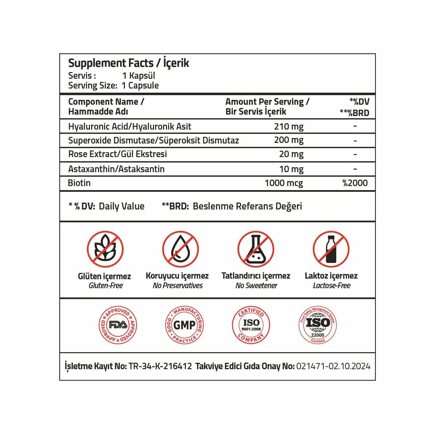Hyaluronik Asit, Süperoksit Dismutaz, Hacim Arttırıcı: Mikrokristalin Selüloz, Gül Ekstresi, Astaksantin, Topaklanmayı Önleyiciler (Yağ Asitlerinin Magnezyum Tuzları: Magnezyum Stearat, Silikon Dioksit), D-biotin.