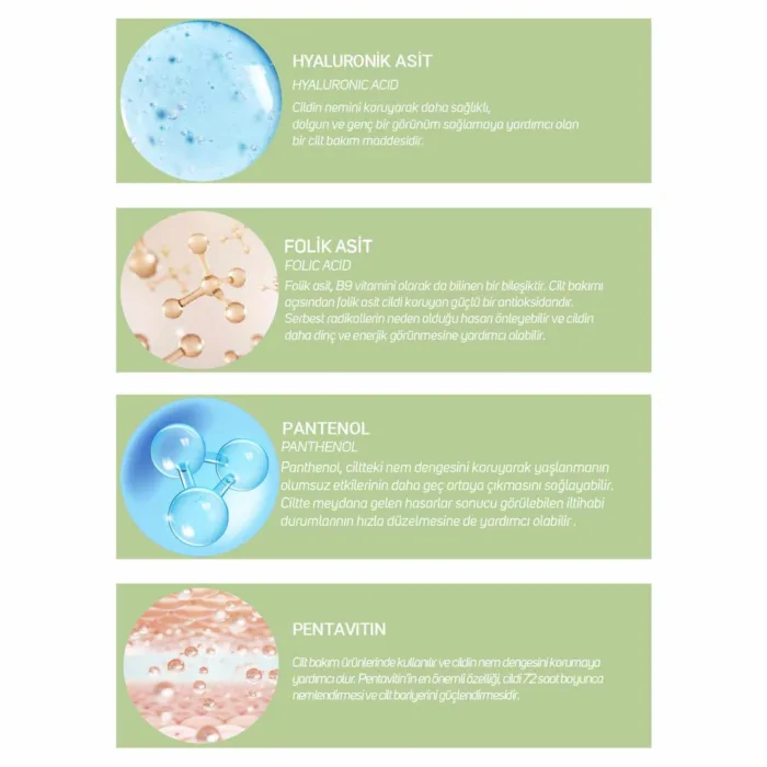 Hyaluronik Asit ve Folik Asit serumu cilde yoğun nem kazandırarak yaşlanma etkilerinin azaltılmasına yardımcı olur.