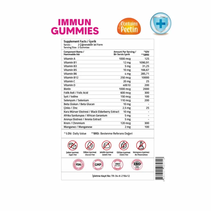 Retinil Asetat, Tiamin Mononitrat, Nikotinamid, Kalsiyum D-pantotenat, Piridoksin Hidroklorür, Metilkobalamin, L-Askorbik Asit, Kolekalsiferol, D-Biotin, Pteroilmonoglutamik asit, Potasyum İyodür, Sodyum Selenit, Beta Glukan, Çinko Sitrat, Kara Mürver Ekstresi, Afrika Sardunyası, Aronya Ekstresi, Krom Pikolinat, Manganez Sülfat, Stabilizör: Maltitol, Deiyonize Su, Jelleştirici: Pektin, Asitlik Düzenleyici: Sitrik Asit, Aroma Verici: Orman Meyvesi Aroması, Tatlandırıcı: Sukraloz, Renklendirici: Pancar Kökü Kırmızısı.