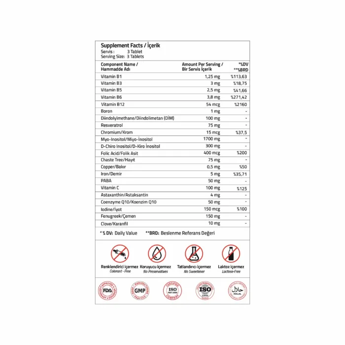 Tiamin Mononitrat, Nikotinamid, Kalsiyum D-Pantotenat , Piridoksin Hidroklorür, Metilkobalamin, Sodyum Borat, Diindolimetan, Resveratrol, Krom Pikolinat, Miyo-İnositol, D-Kiro İnositol, Folik Asit, Hayıt, Bakır Sülfat, Demir Bisglisinat, PABA, L-Askorbik Asit, Astaksantin, Koenzim Q10, Potasyum İyodür, Çemen, Karanfil, Hacim Arttırıcı (Mikrokristalin selüloz), Stabilizör (polivinilpirolidon), Topaklanmayı önleyiciler (silikon dioksit, yağ asitlerinin magnezyum tuzları).