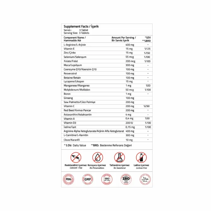 L-Arjinin, Vitamin E, Çinko, Selenyum, Folat, Lepidyum, Koenzim Q10, Resveratrol, Betain, Likopen, Manganez, Molibden, Boron, Ginseng, Cüce Palmiye, Vitamin C, Kırmızı Pancar, Astaksantin, Vitamin A, Vitamin D3, İyot, Arjinin Alfa Ketoglutarat, L-Karnitin, Karanfil, Hacim Arttırıcı (Mikrokristalin selüloz), Stabilizör (polivinilpirolidon), Topaklanmayı önleyiciler (silikon dioksit, yağ asitlerinin magnezyum tuzları).