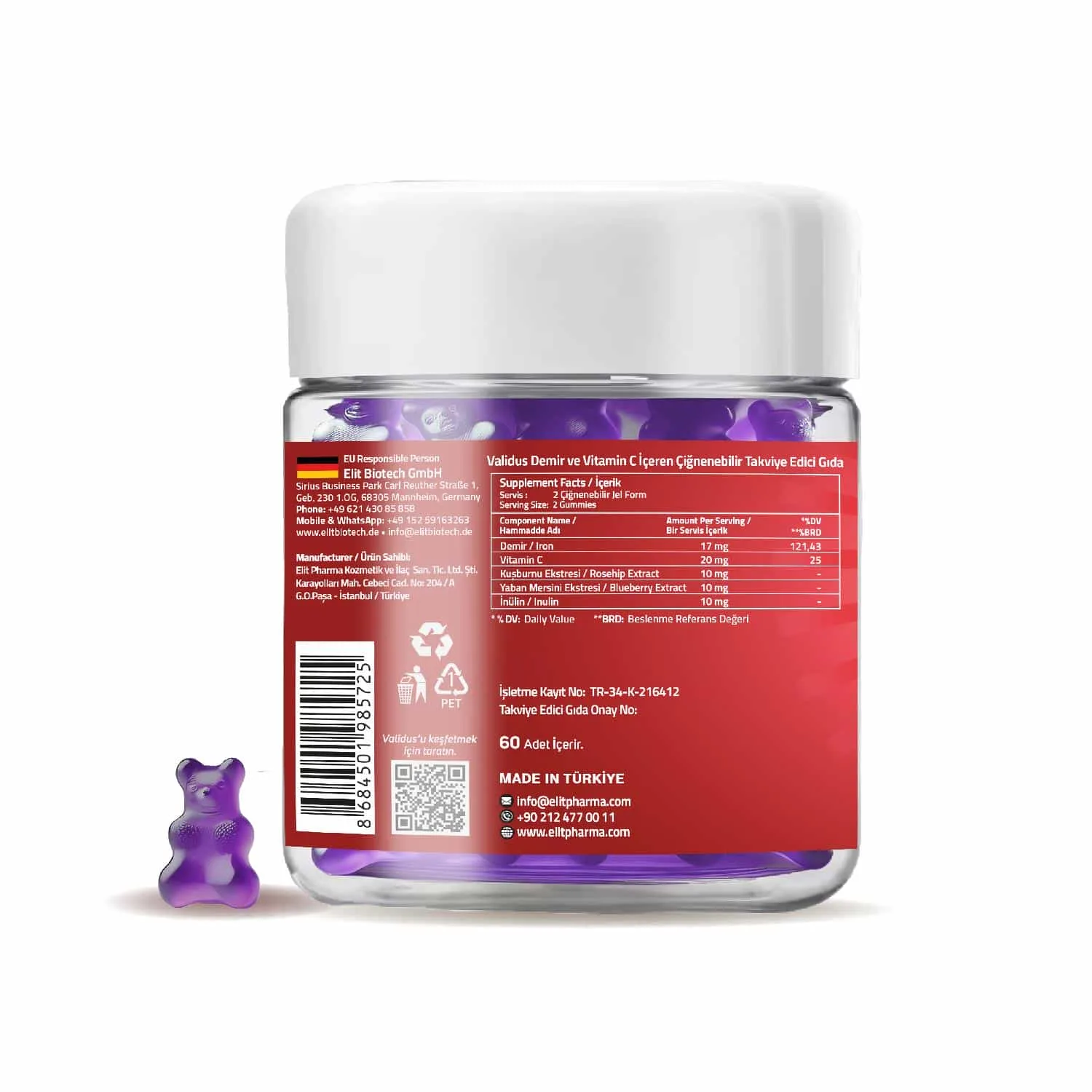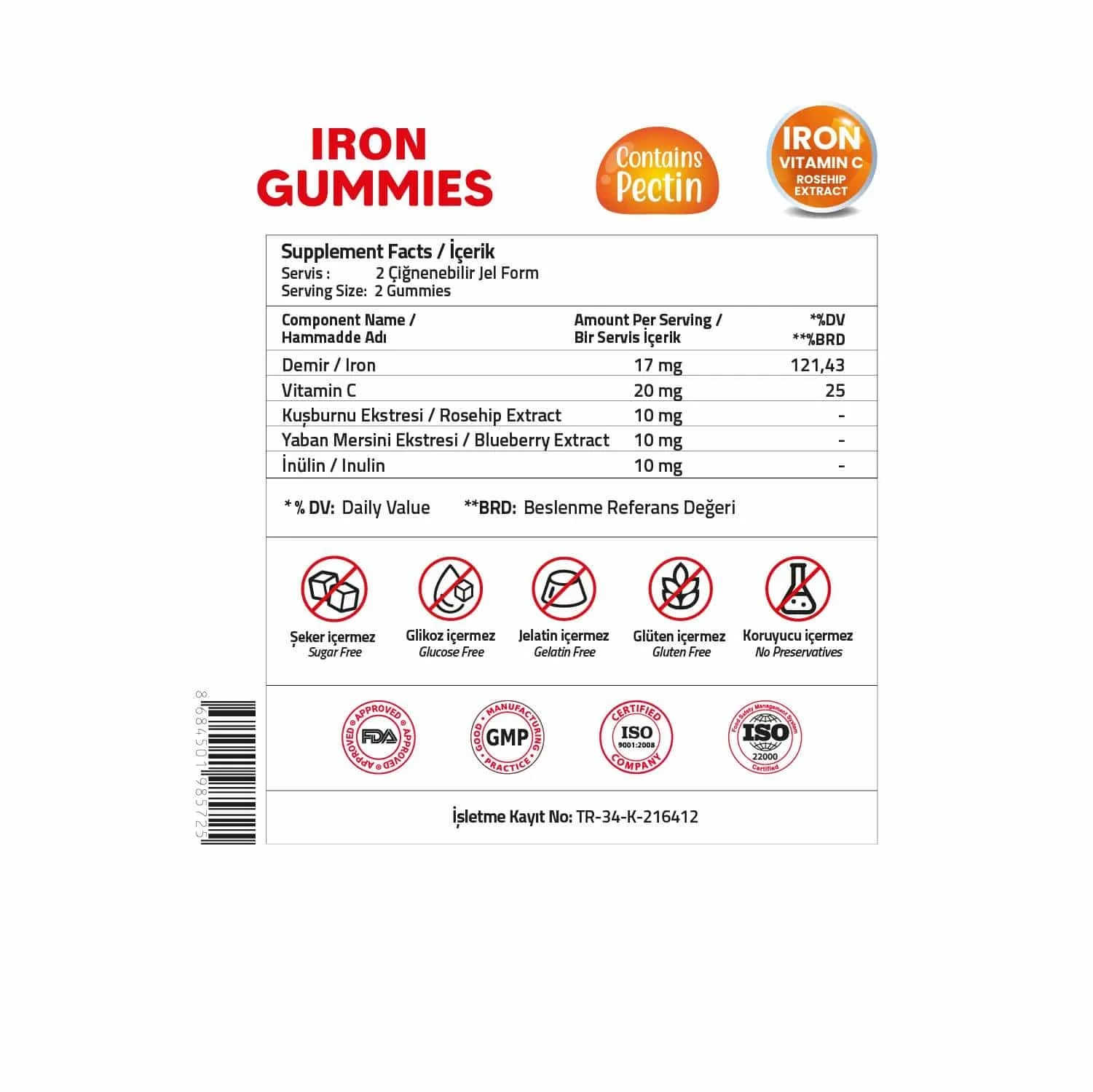 İçindekiler: Demir Bisglisinat, L-Askorbik Asit, Kuşburnu Ekstresi, Yaban Mersini Ekstresi, İnülin, Stabilizör: Maltitol, Deiyonize Su, Jelleştirici: Pektin, Asitlik Düzenleyici: Sitrik Asit, Aroma Verici: Çilek Aroması, Tatlandırıcı: Sukraloz, Renklendirici: Pancar Kökü Kırmızısı