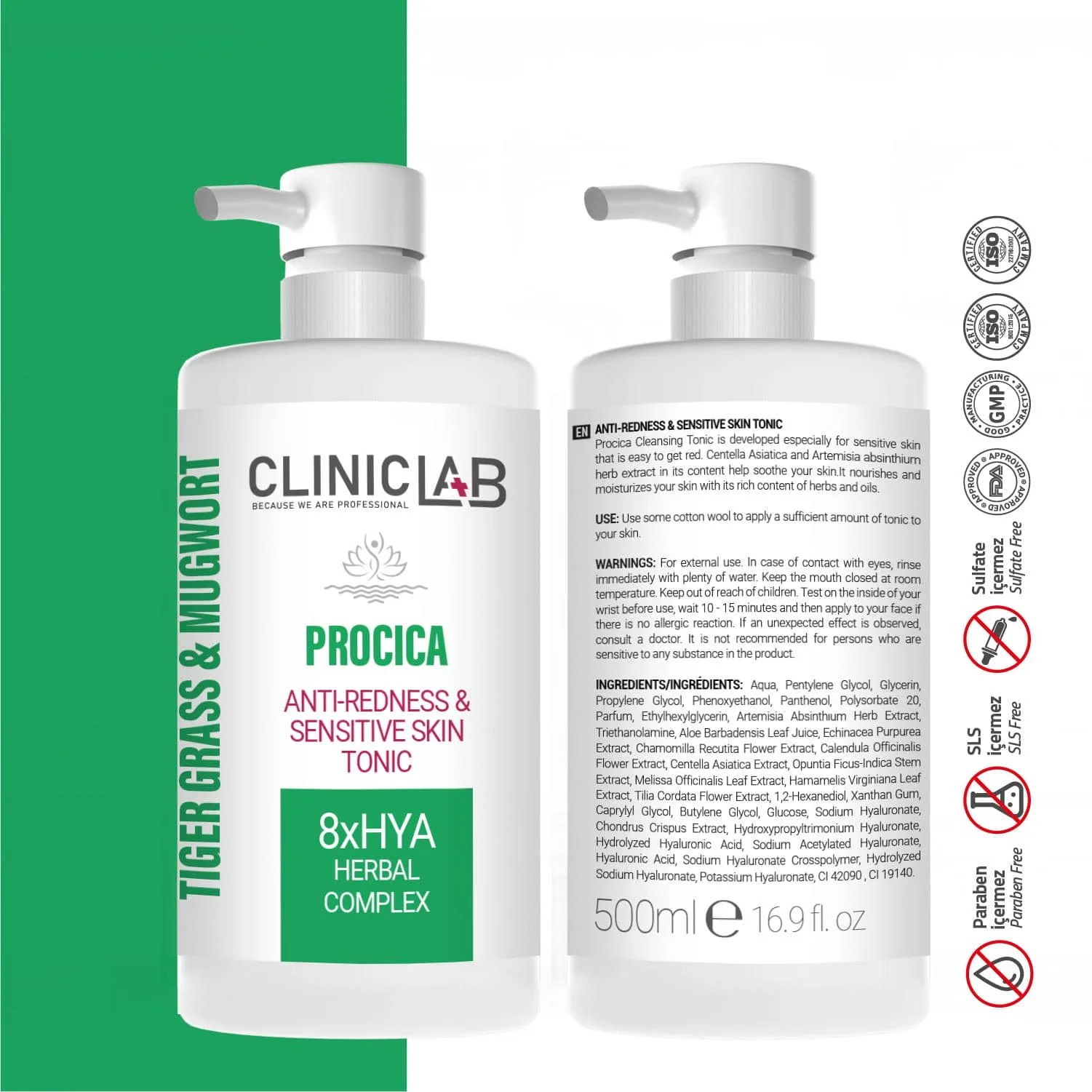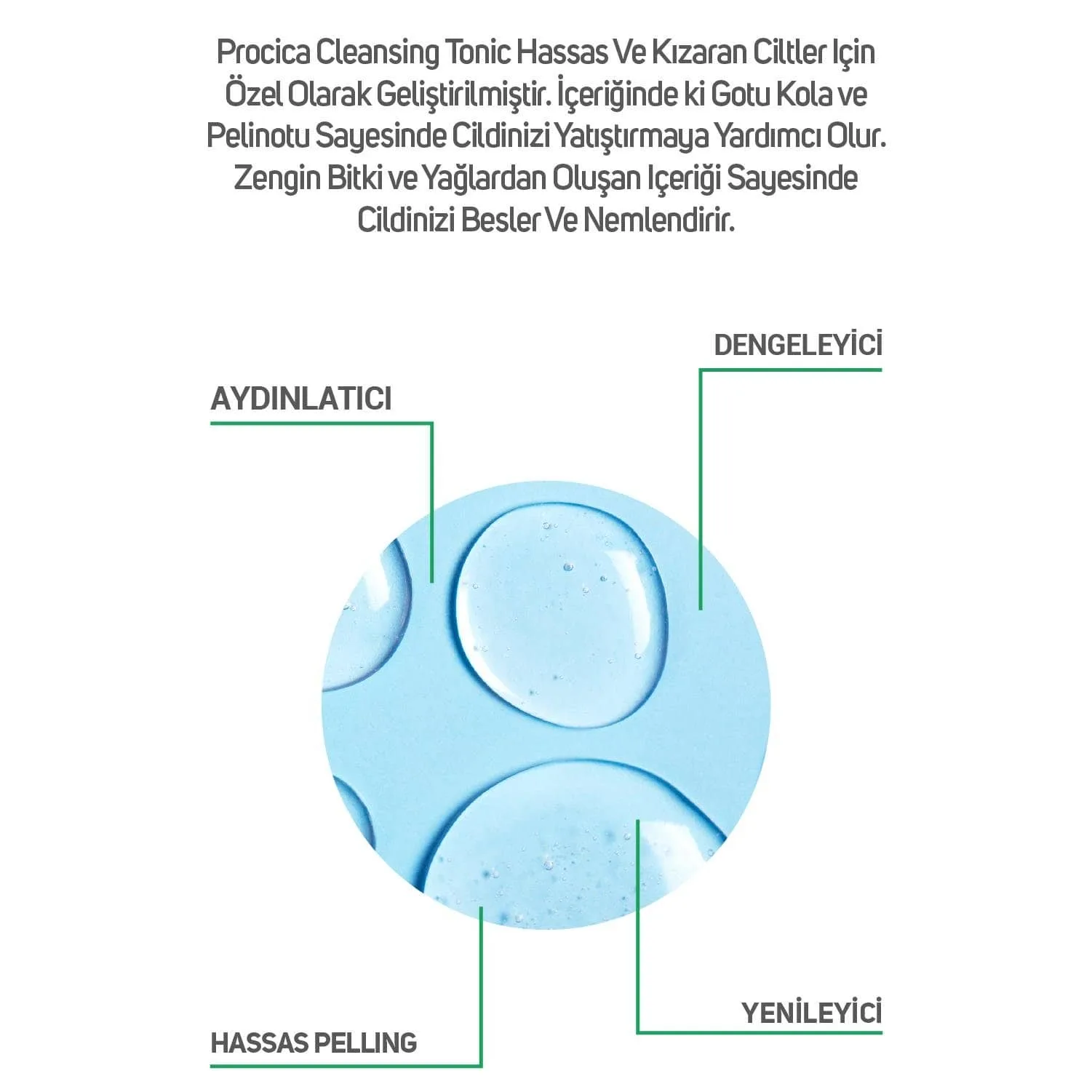 Procica temizleyici cilt Toniği Hassas ve kızaran ciltler için özel olarak geliştirilmiştir. İçeriğinde ki Gotu Kola ve Pelinotu sayesinde cildinizi yatıştırmaya yardımcı olur. Zengin bitki ve yağlardan oluşan içeriği sayesinde cildinizi besler ve nemlendirir.