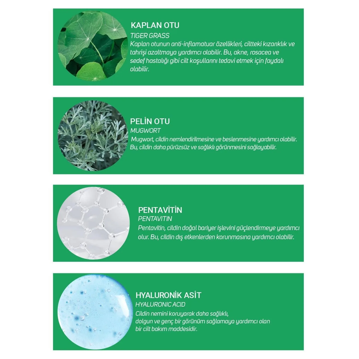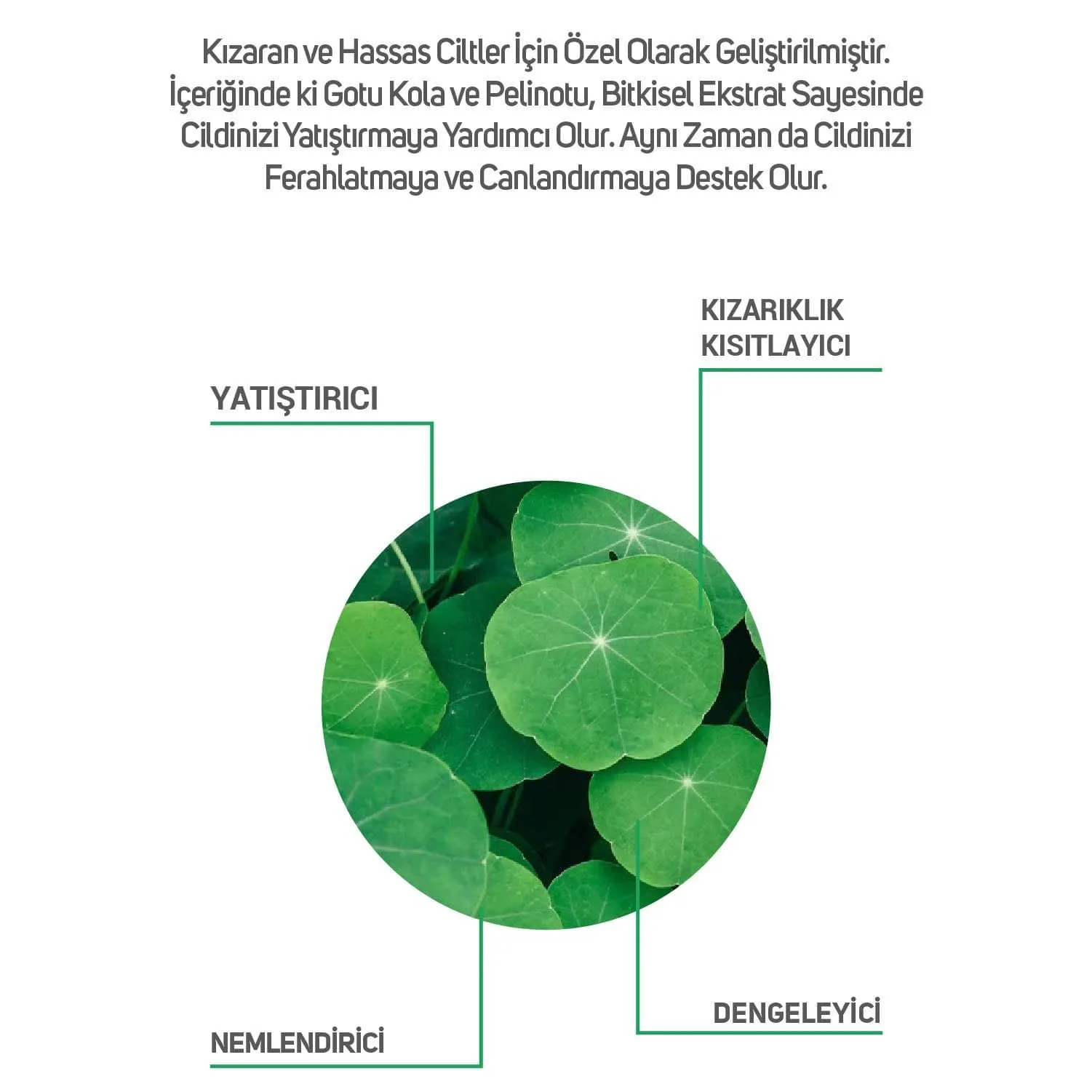 Kızaran ve Hassas ciltler için özel olarak geliştirilmiştir. İçeriğinde ki Gotu Kola ve Pelinotu, Bitkisel Ekstrat sayesinde cildinizi yatıştırmaya yardımcı olur. Aynı zaman da cildinizi ferahlatmaya ve canlandırmaya destek olur.