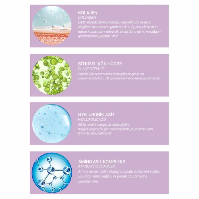 İçeriğinde yoğun miktarda bulunan kolajen, hyaluronik asit, amino asitler ve vitamin E ile cildin nemlendirilmesine, canlı ve parlak bir görümüne kavuşmasına yardımcı olur.