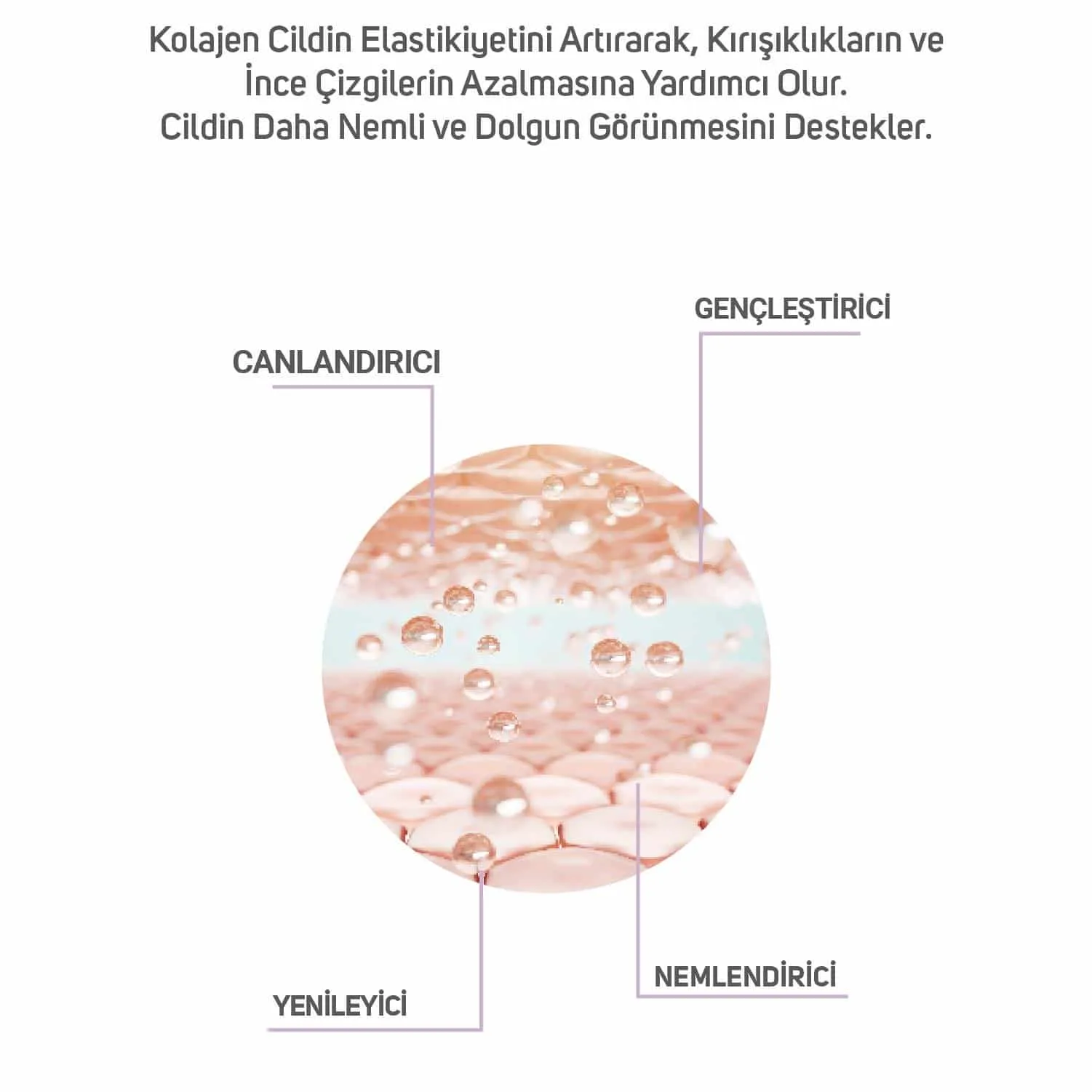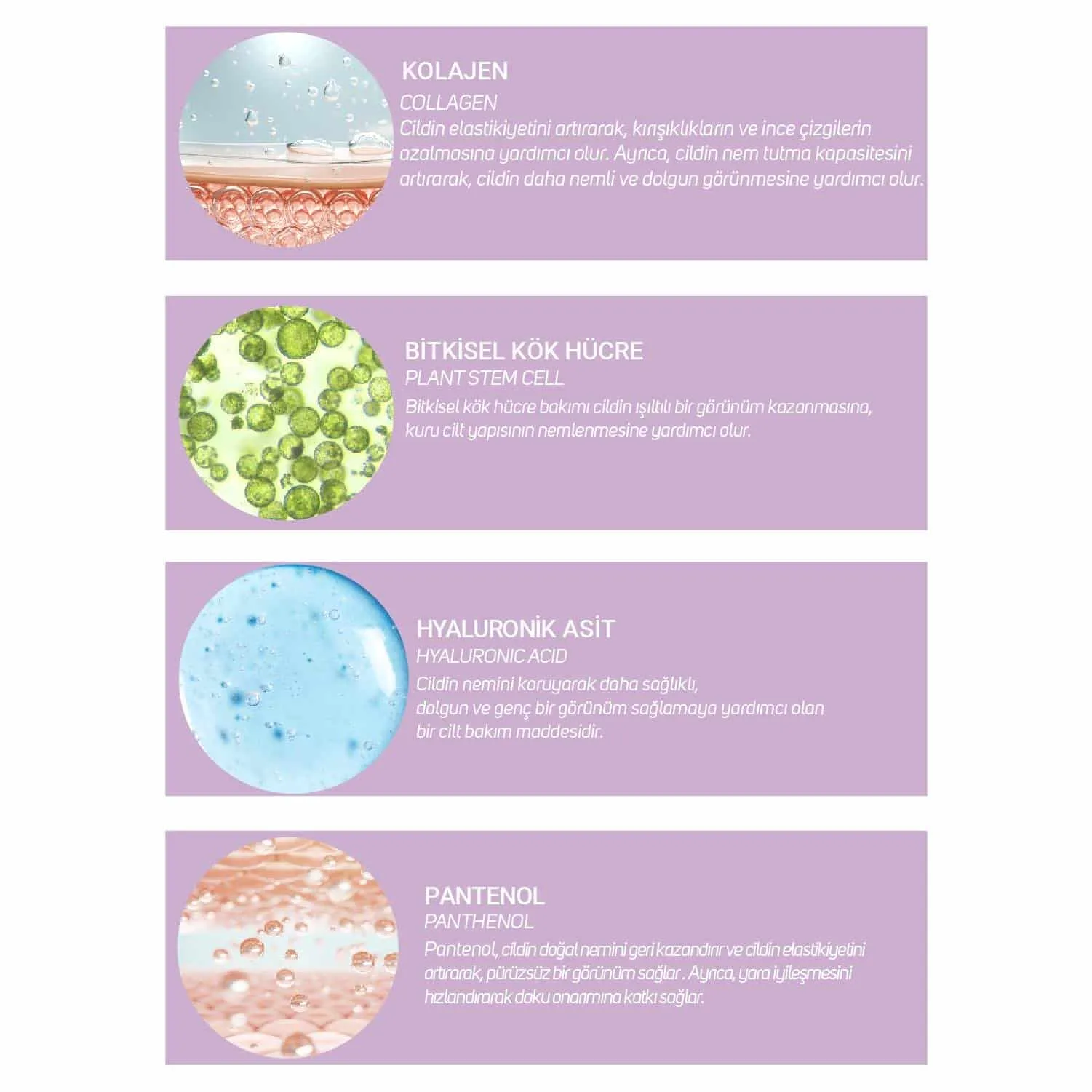 İçeriğinde yoğun miktarda bulunan kolajen, hyaluronik asit, panthenol ile cildin nemlendirilmesine, canlı ve parlak bir görünüme kavuşmasına yardımcı olur.