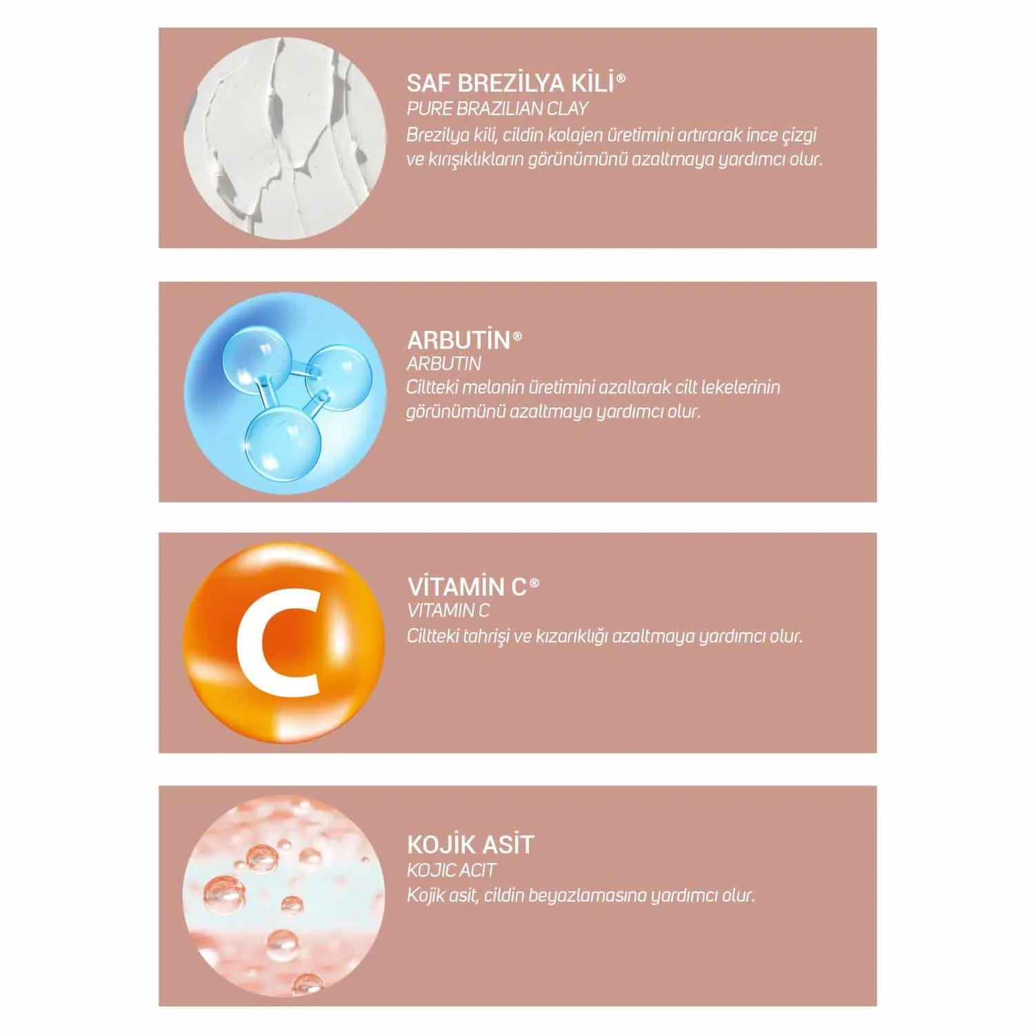 Hyaluronik Asit, Arbutin, Kojik Asit, Bisabolol içeren güçlü formülü ile lekeye meyilli ciltler için geliştirilmiştir. Deniz, rüzgar, güneş vb. dış etkenlerden kaynaklanan leke oluşumunu önlemeye yardımcı olur. İçeriğinde bulunan özel kil, cildi derinlemesine temizleyerek, siyah noktalardan arındırmaya olanak sağlar.
