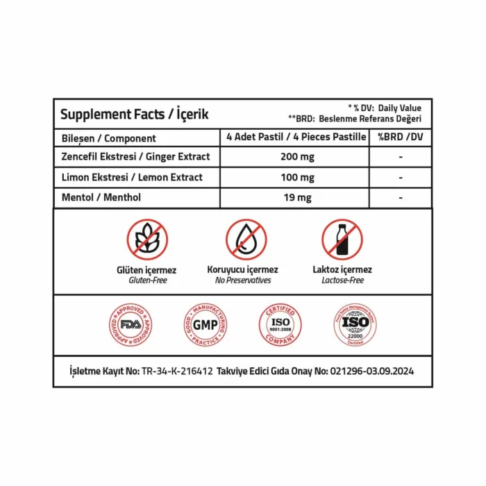 Şeker (Pancar), Glukoz Şurubu, Zencefil Ekstresi, Limon Ekstresi, Bal, Aroma Vericiler (Limon Aroması, Bal Aroması, Ökaliptus Aroması), Mentol,  Asitlik Düzenleyici: Sitrik Asit, Ökaliptus Yağı, Renklendirici: Kurkumin.