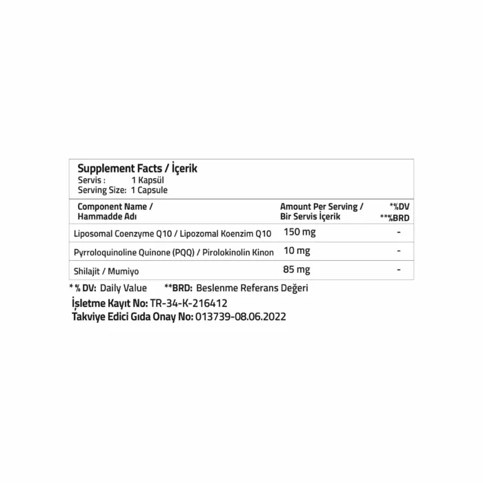İçindekiler: Koenzim Q10 (Lipozomal), Mumiyo(Şilajit), Kapsül Bileşeni (Hidroksipropil metil selüloz, Gellan zamkı), Hacim Arttırıcı (Mikrokristalin selüloz), Pirolokinolin Kinon, Topaklanmayı önleyiciler (silikon dioksit, yağ asitlerinin magnezyum tuzları).